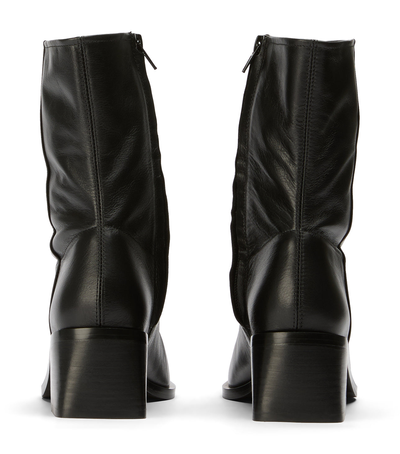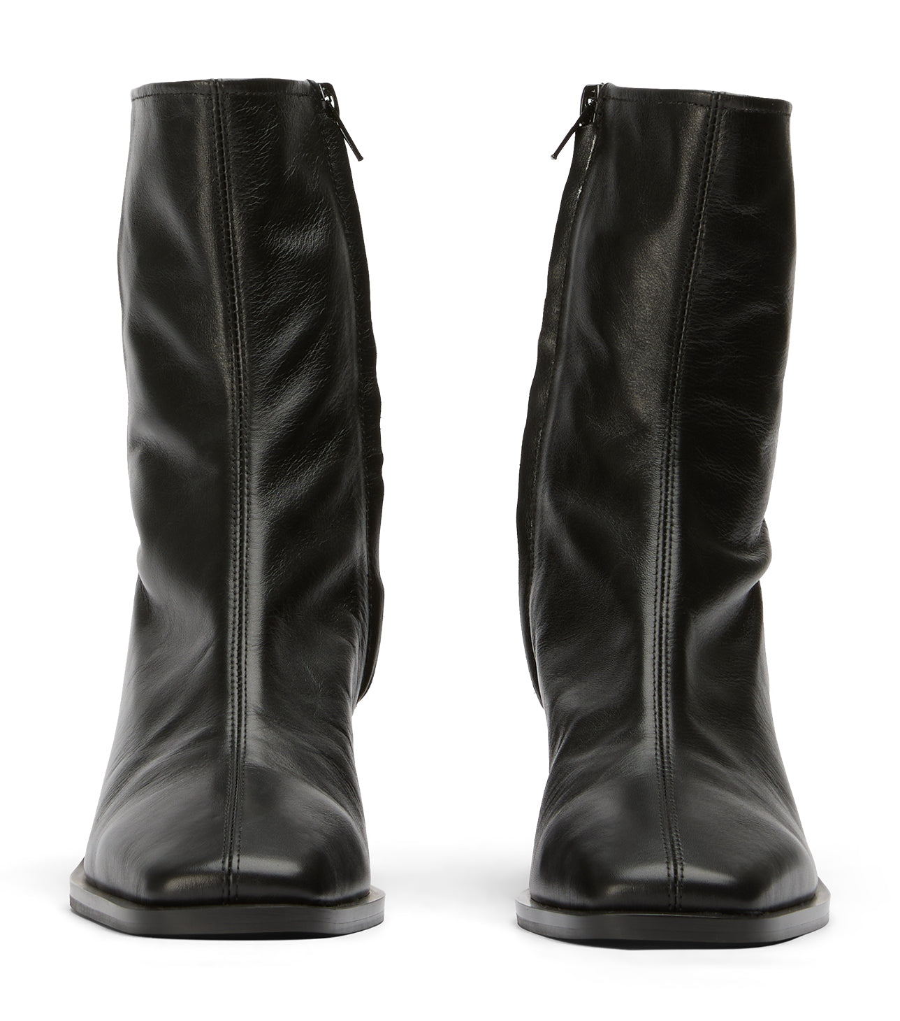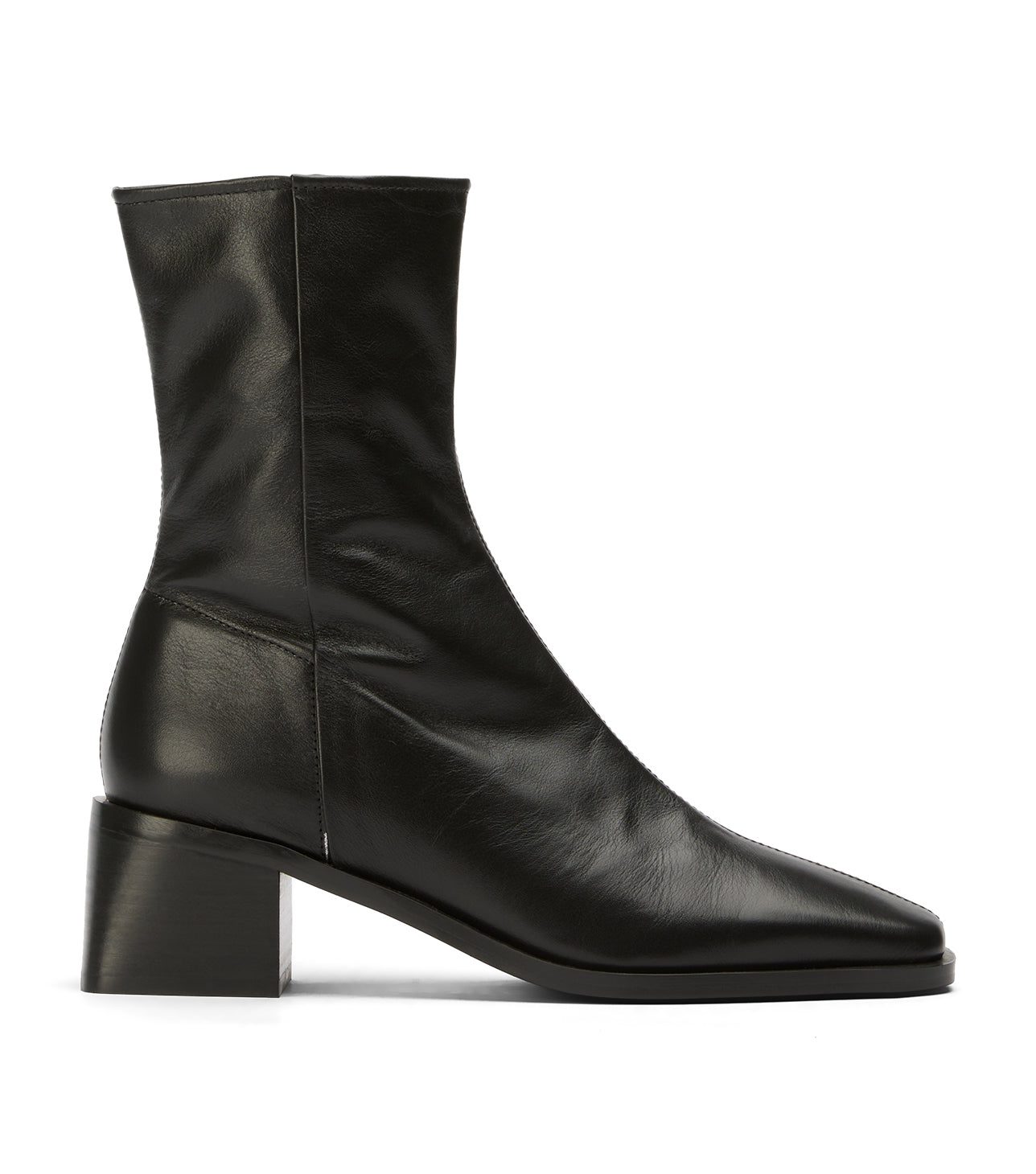 Step into the new season with Remi, a masterclass in minimalist edge. This striking leather ankle boot features a clean, glove-like fit and a bold square-toe silhouette that grounds any outfit with modern authority. Set upon a sturdy, mid-height block heel for effortless stability, the Remi is the definitive women’s black boot for those who value both high-fashion aesthetics and everyday versatility.