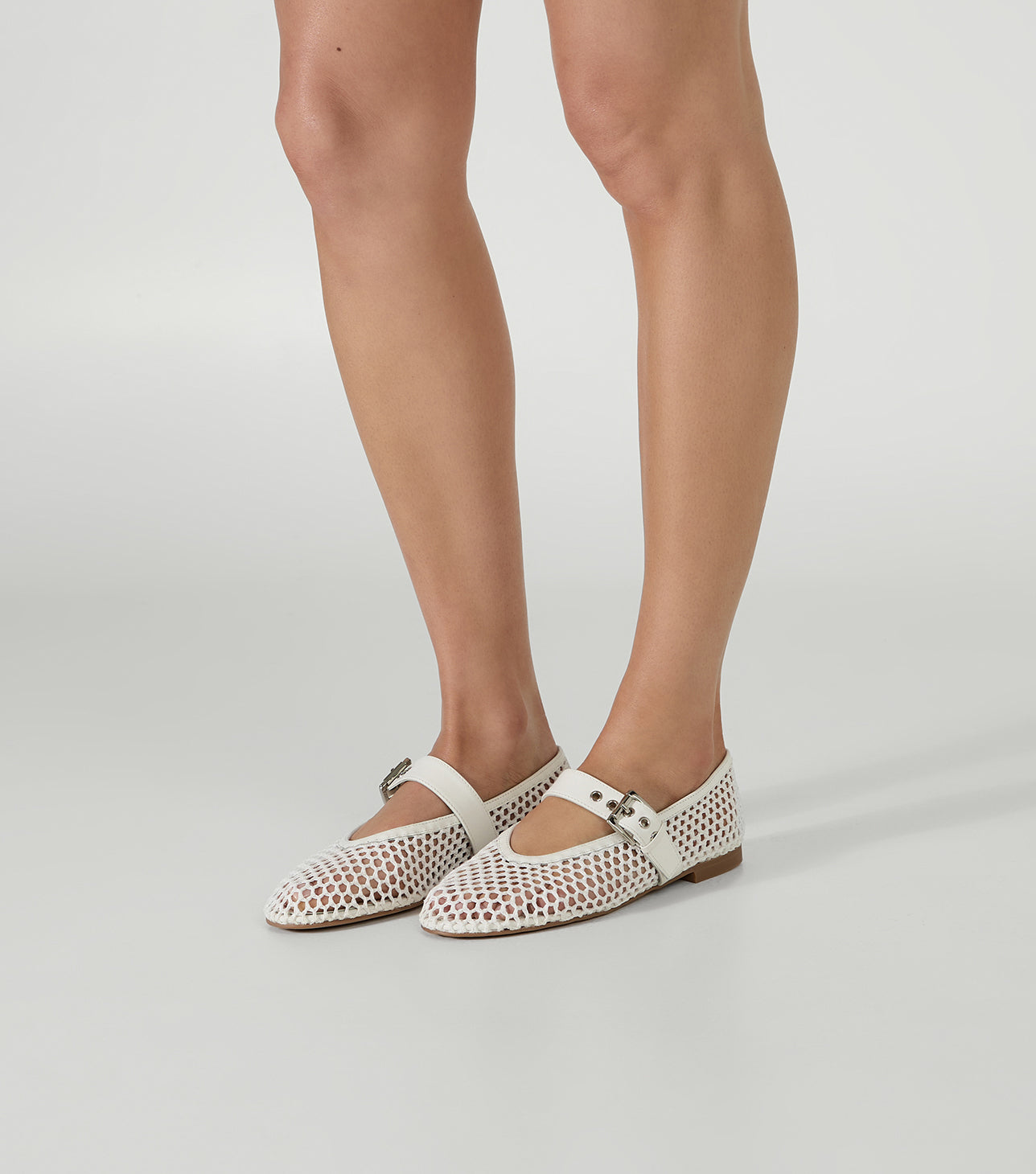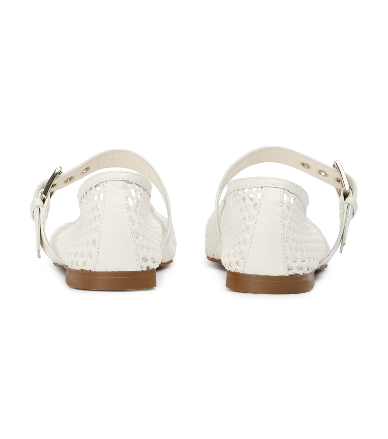 Effortlessly master this season’s most coveted trend with Carla, a contemporary braided mary-jane that balances artisanal charm with a high-fashion edge. This striking ballet flat features an intricate open-mesh weave, offering a lightweight and breathable feel that is perfect for warm-weather styling. Secured with a bold, leather buckled strap and polished silver-toned eyelets, Carla is the essential women’s white flat for those seeking a unique, modern twist on a classic silhouette.
