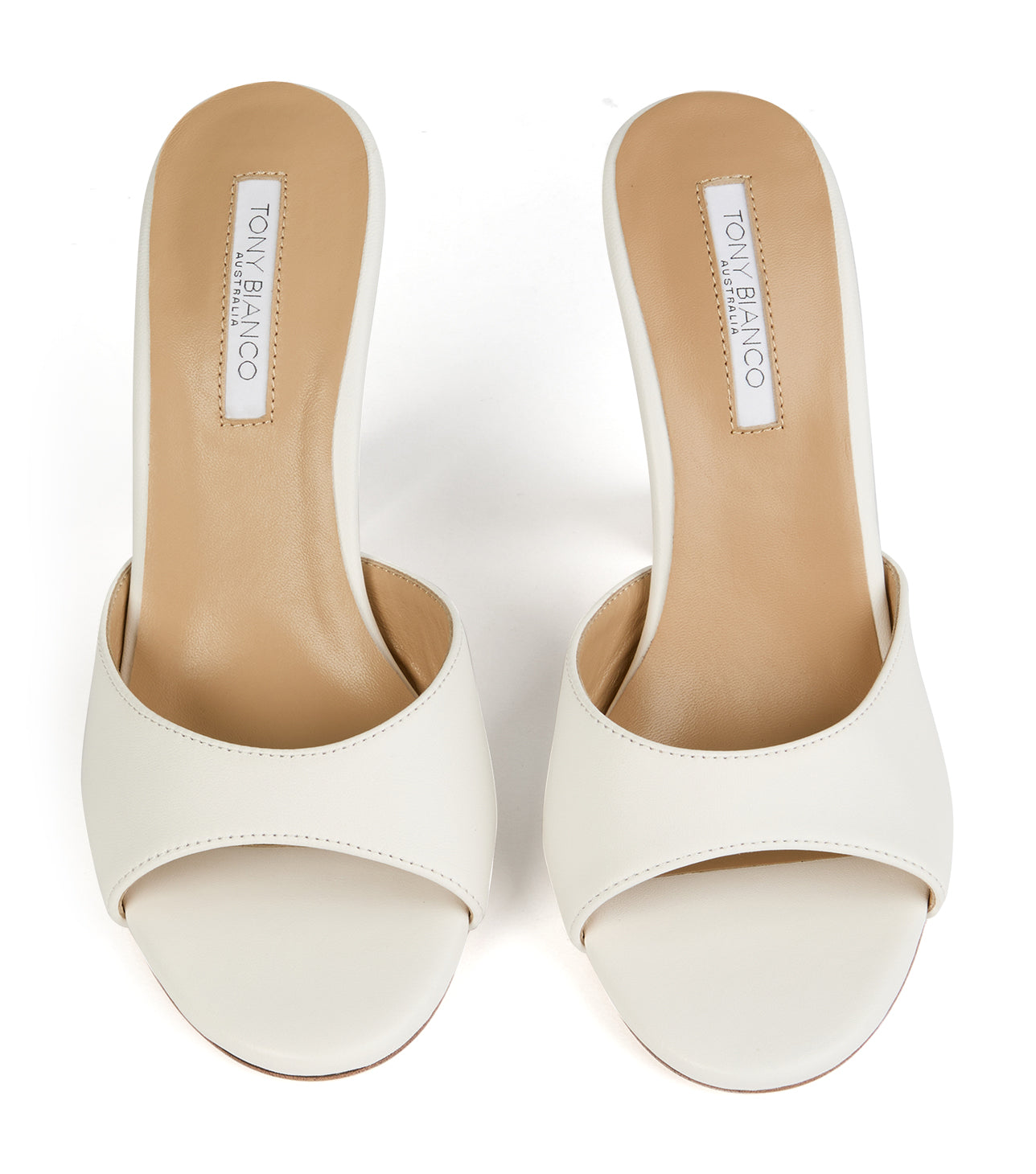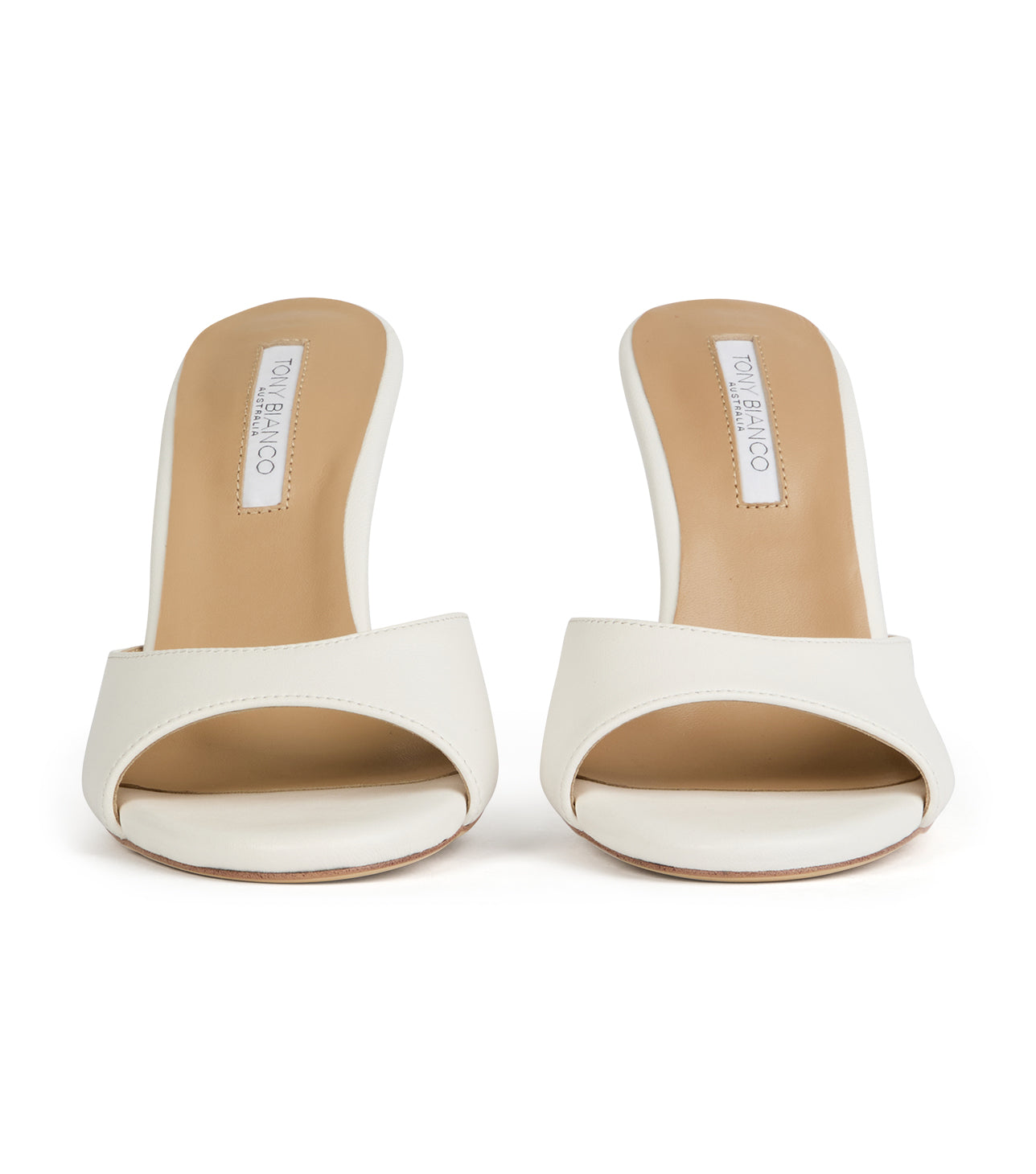 Slip into elevated style with Victoria. Crafted in leather, this mule heel features an open toe, curved vamp, and a thicker heel base for comfort and refined appeal.
