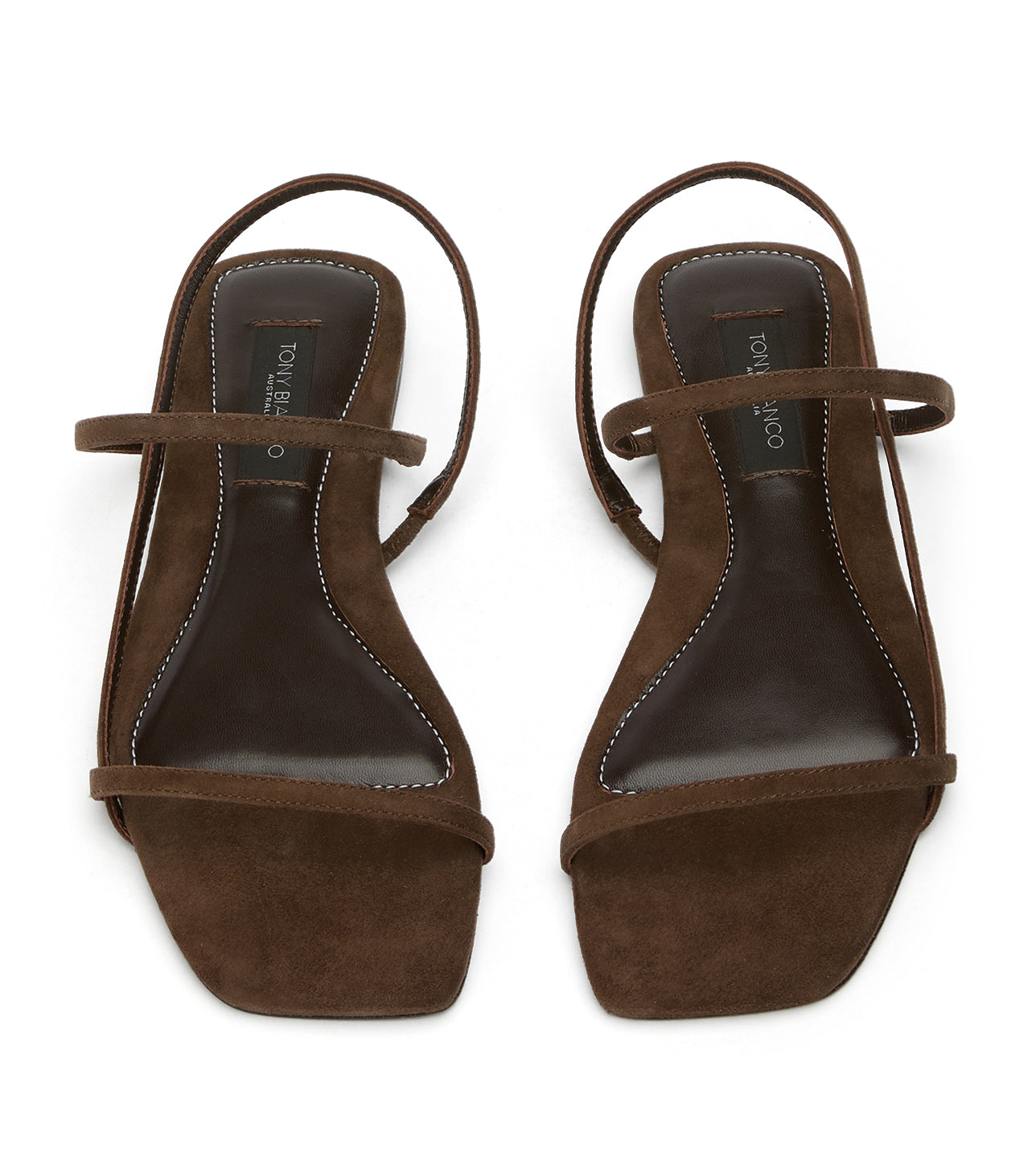 Pared-back and modern, Rimini is a flat suede leather sandal with slender straps and an open square toe. A clean silhouette designed for effortless wear.