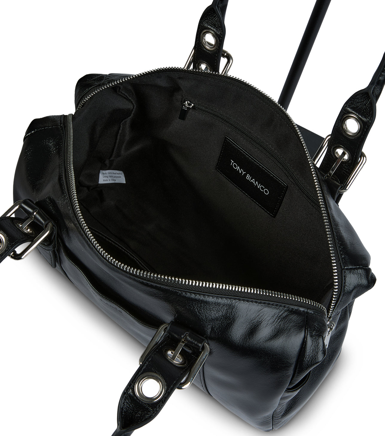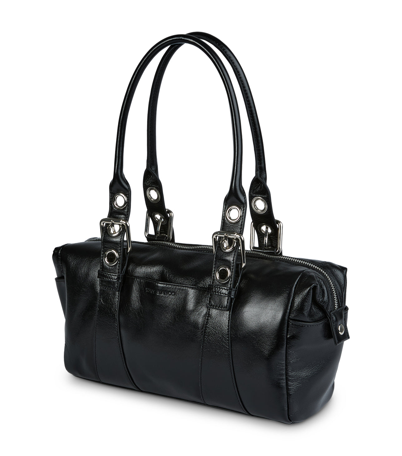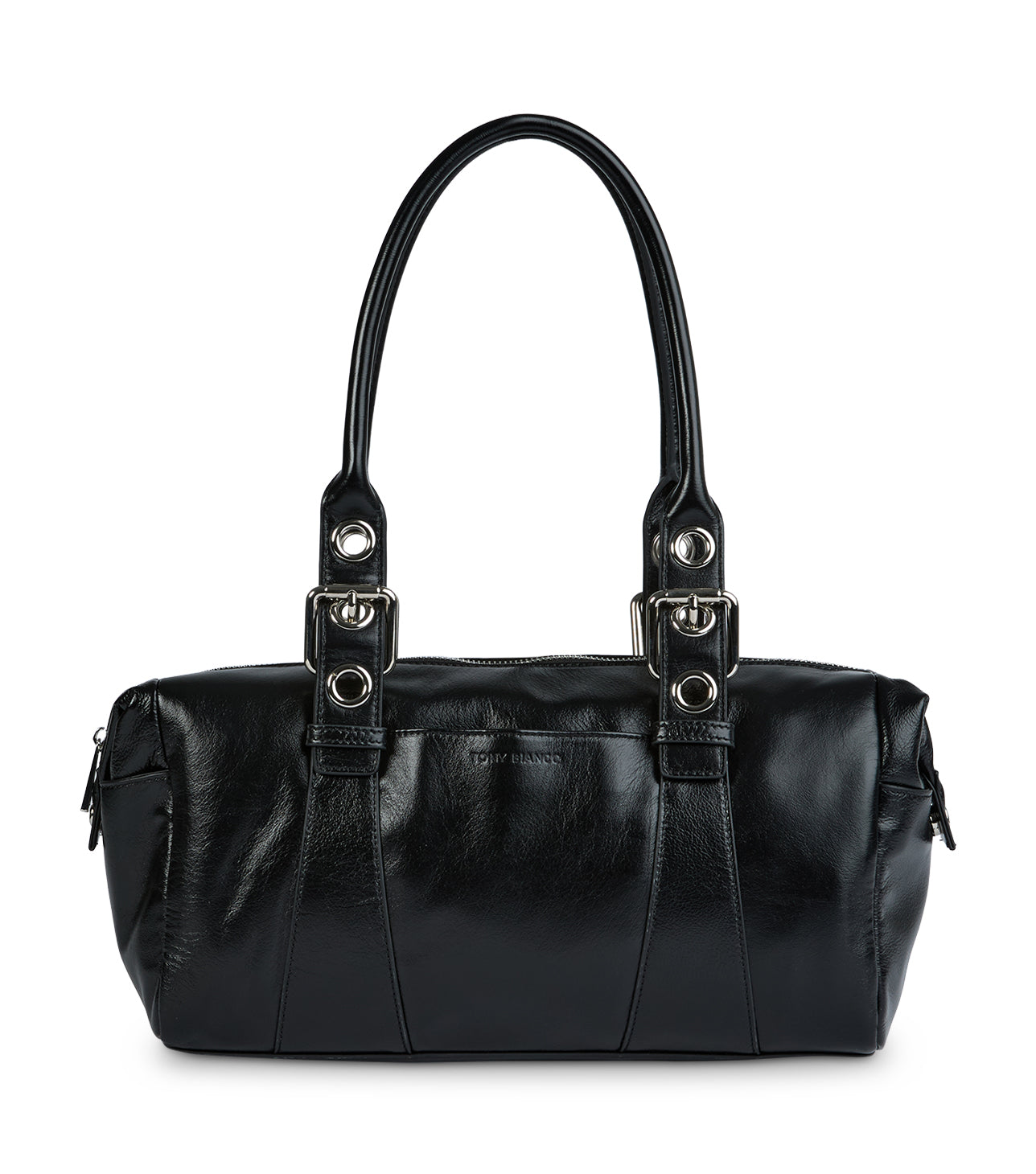 Meet Zarly, a standout black leather shoulder bag with a chic, modern edge. This medium-sized handbag is defined by its striking silver eyelet and buckle detailing, adding a touch of bold style to its structured, duffle-inspired silhouette. With its soft leather and eye-catching hardware, the Zarly is the perfect statement bag to elevate any outfit from day to night.