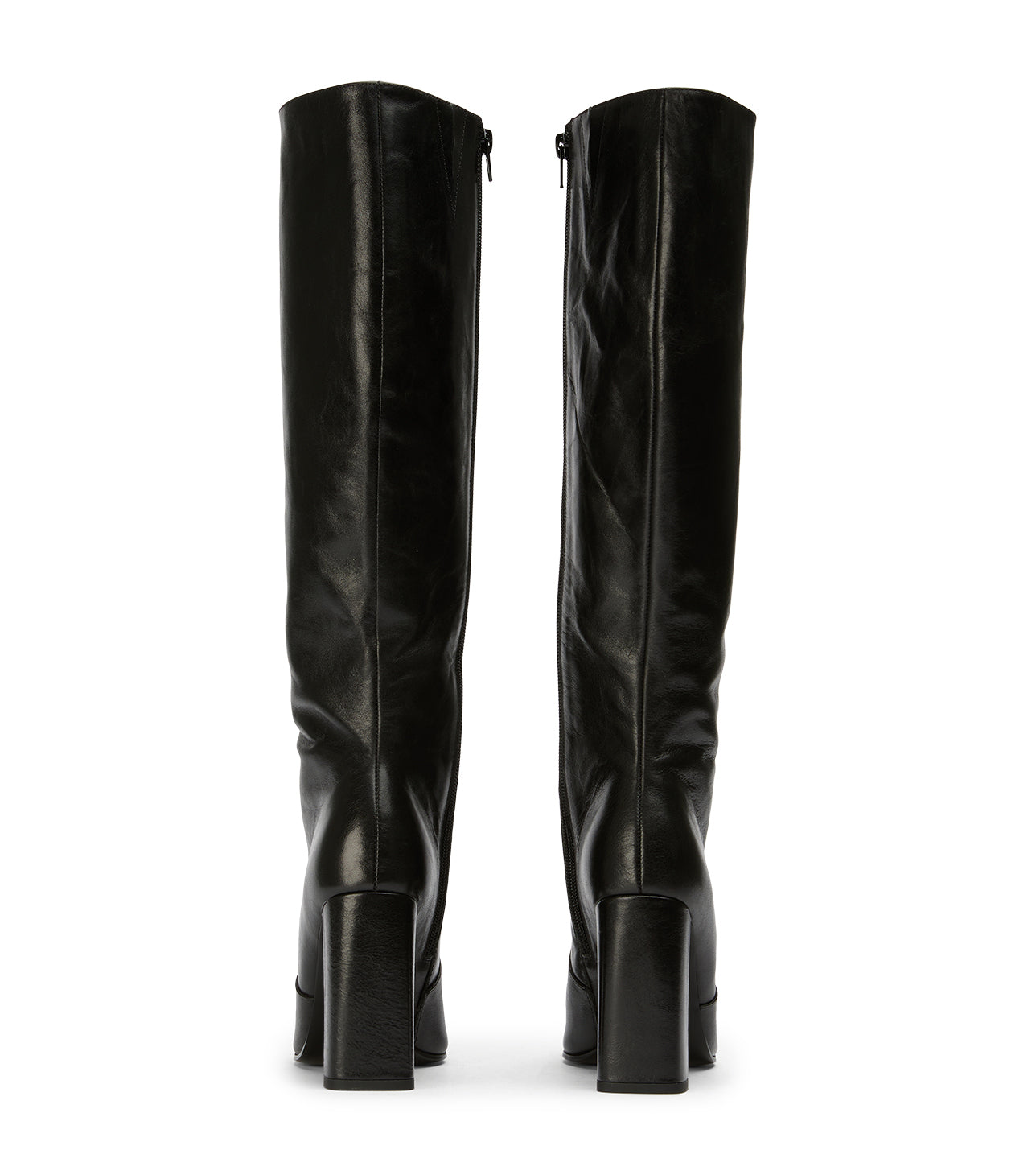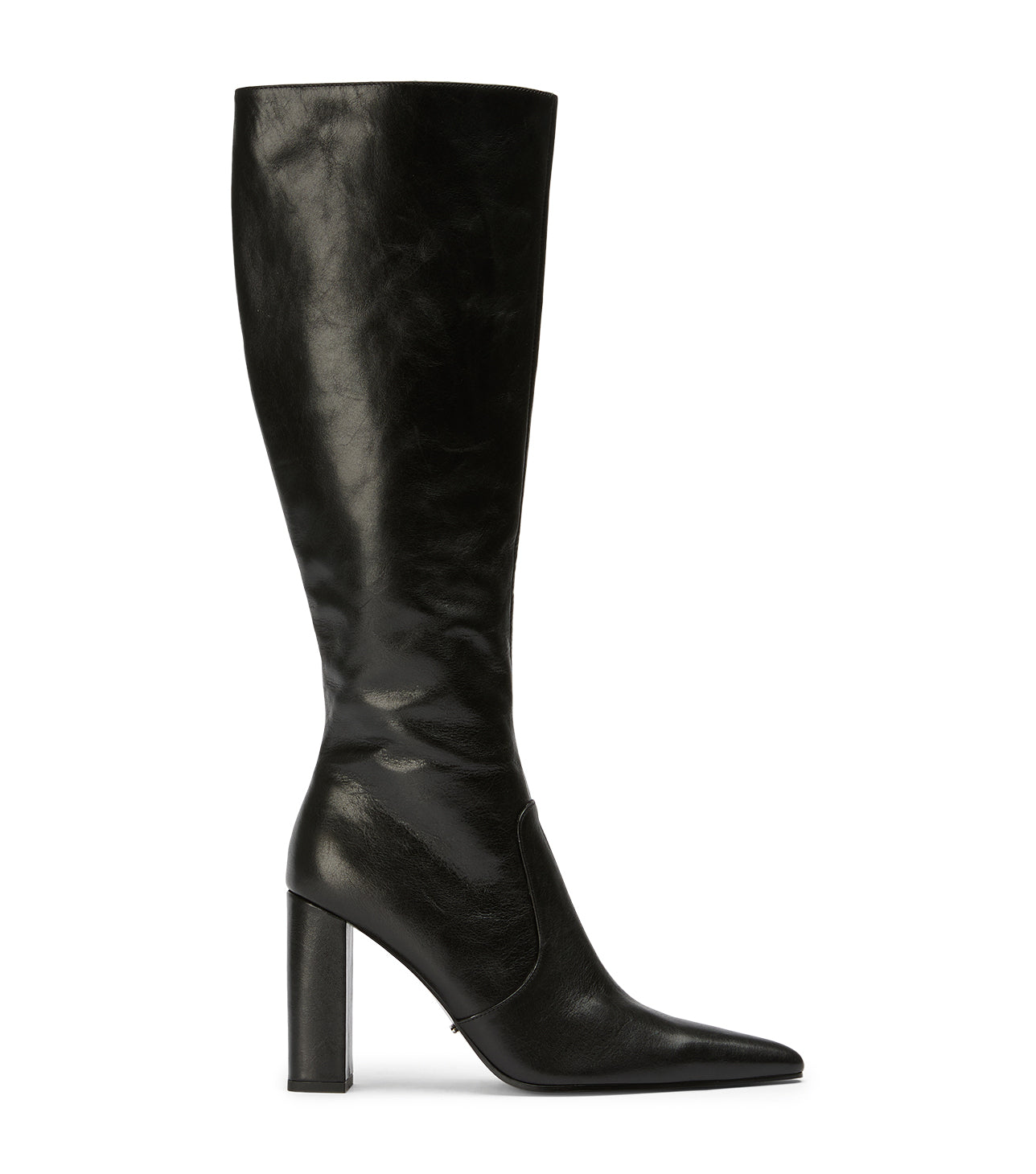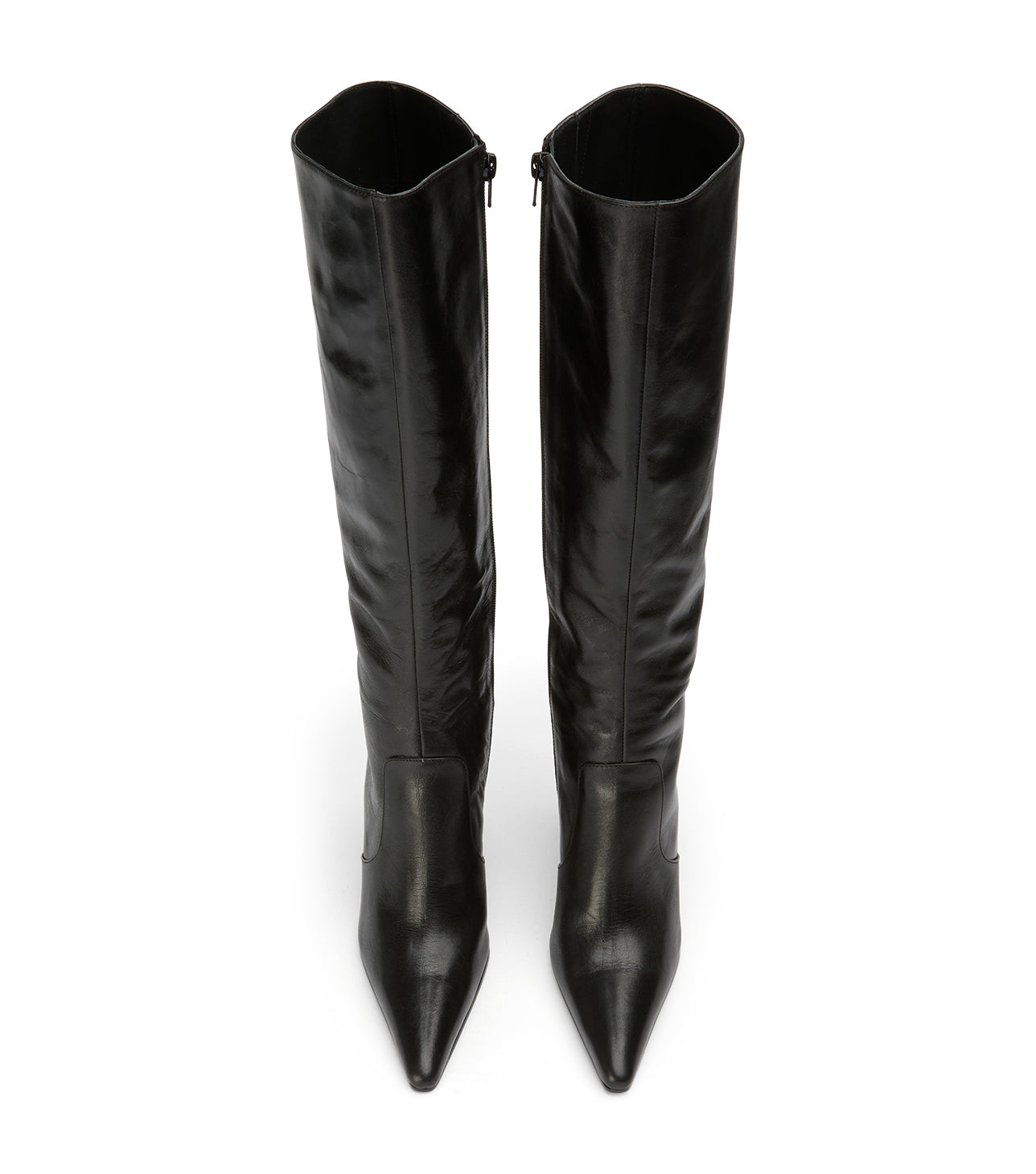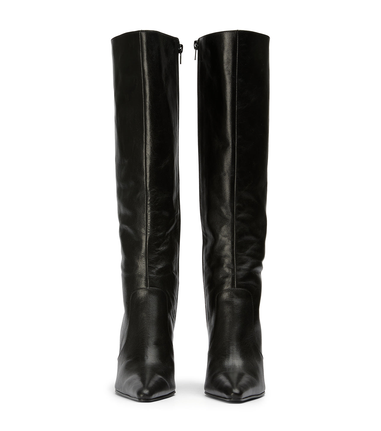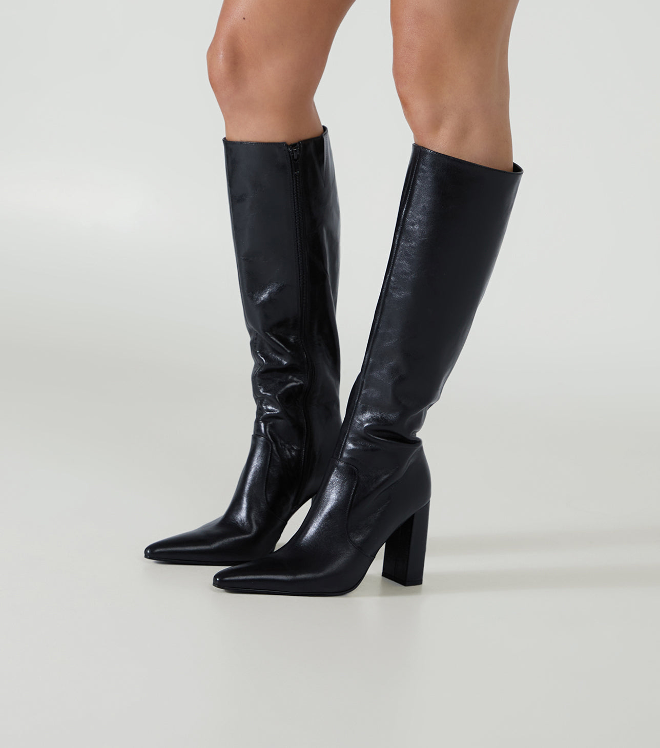 Make a bold statement with the Finesse knee-high boot, This striking silhouette is defined by its dramatic pointed toe and a structured, high-reaching shaft that creates a sharp, architectural profile. Set on a towering, but sturdy block heel for a fusion of high-fashion height and grounded stability, the Finesse calf boot is the essential women’s dress boot for high-impact evening style.