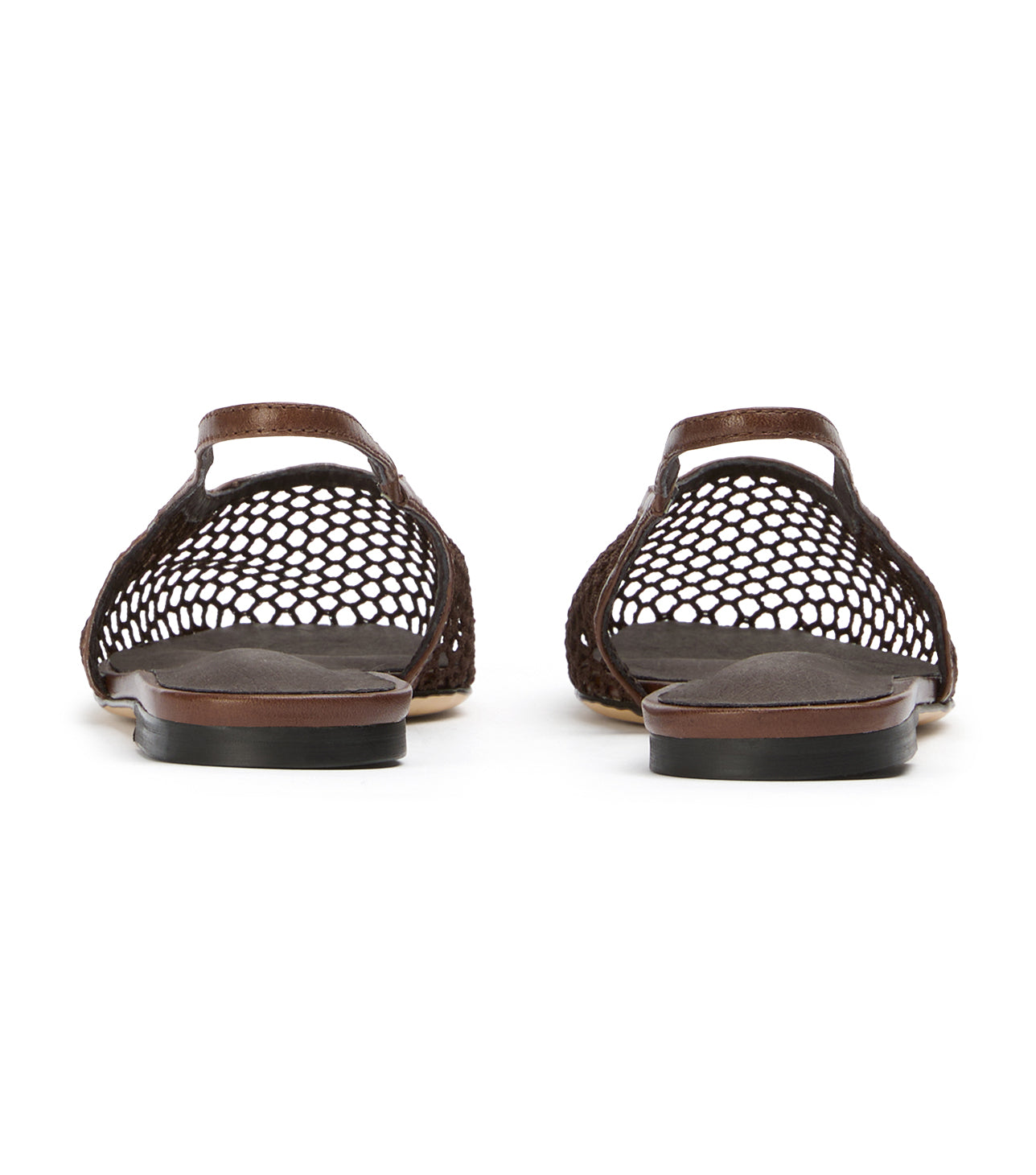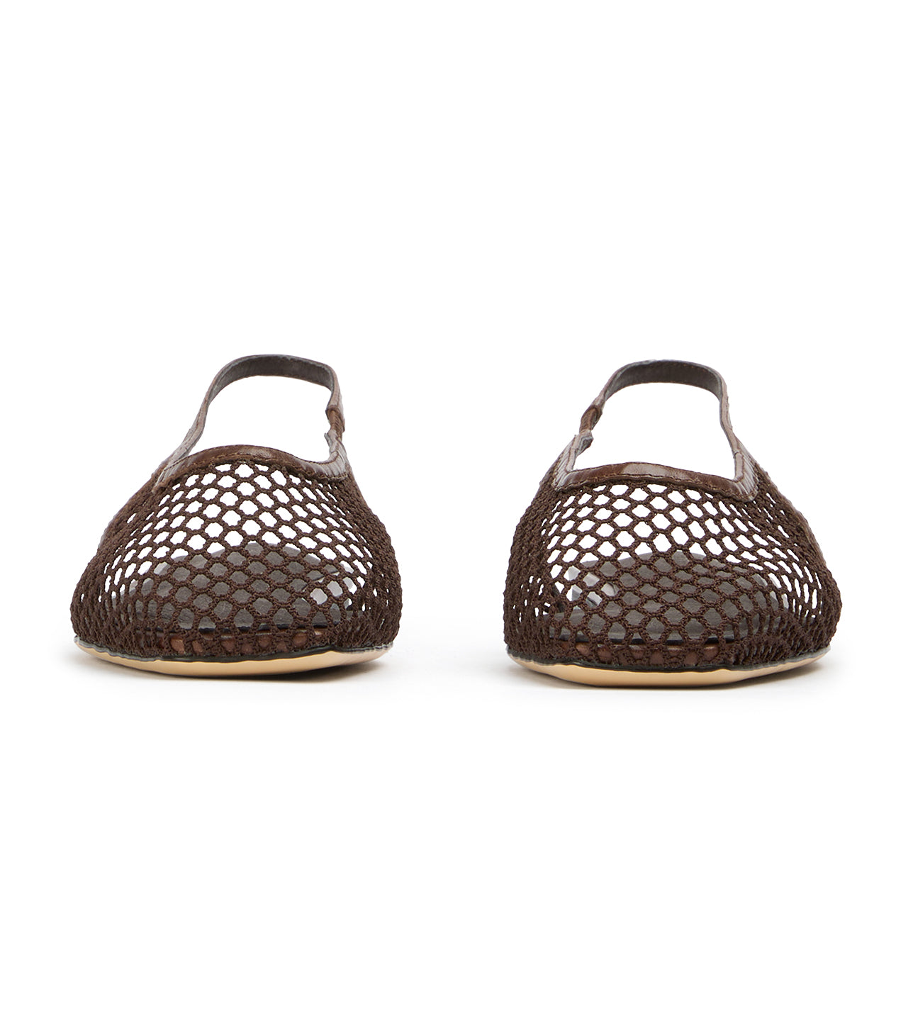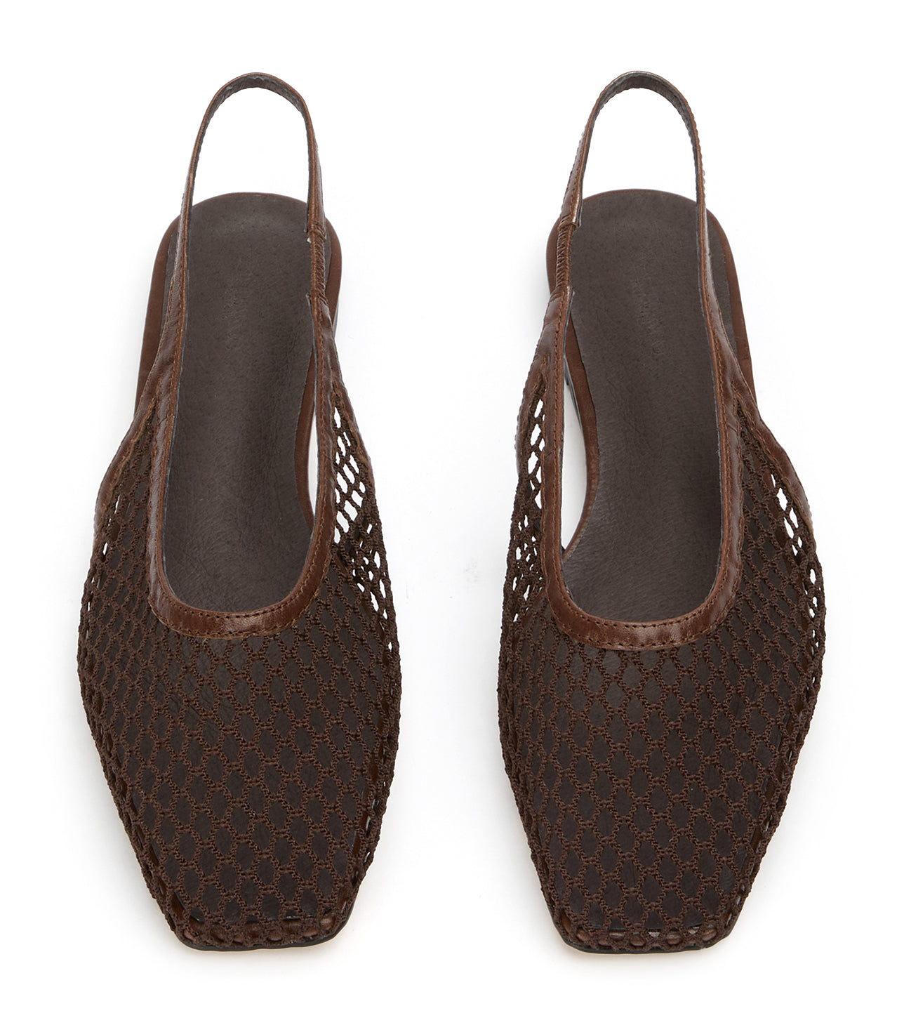 Introducing Bosco, a sleek and sophisticated sling back ballet flat. Expertly crafted from delicate mesh netting, this flat offers breathability and a modern aesthetic. The classic square toe design elevates the look, making it the perfect contemporary mesh flat for all-day wear. Available in choc mesh for a statement look.
