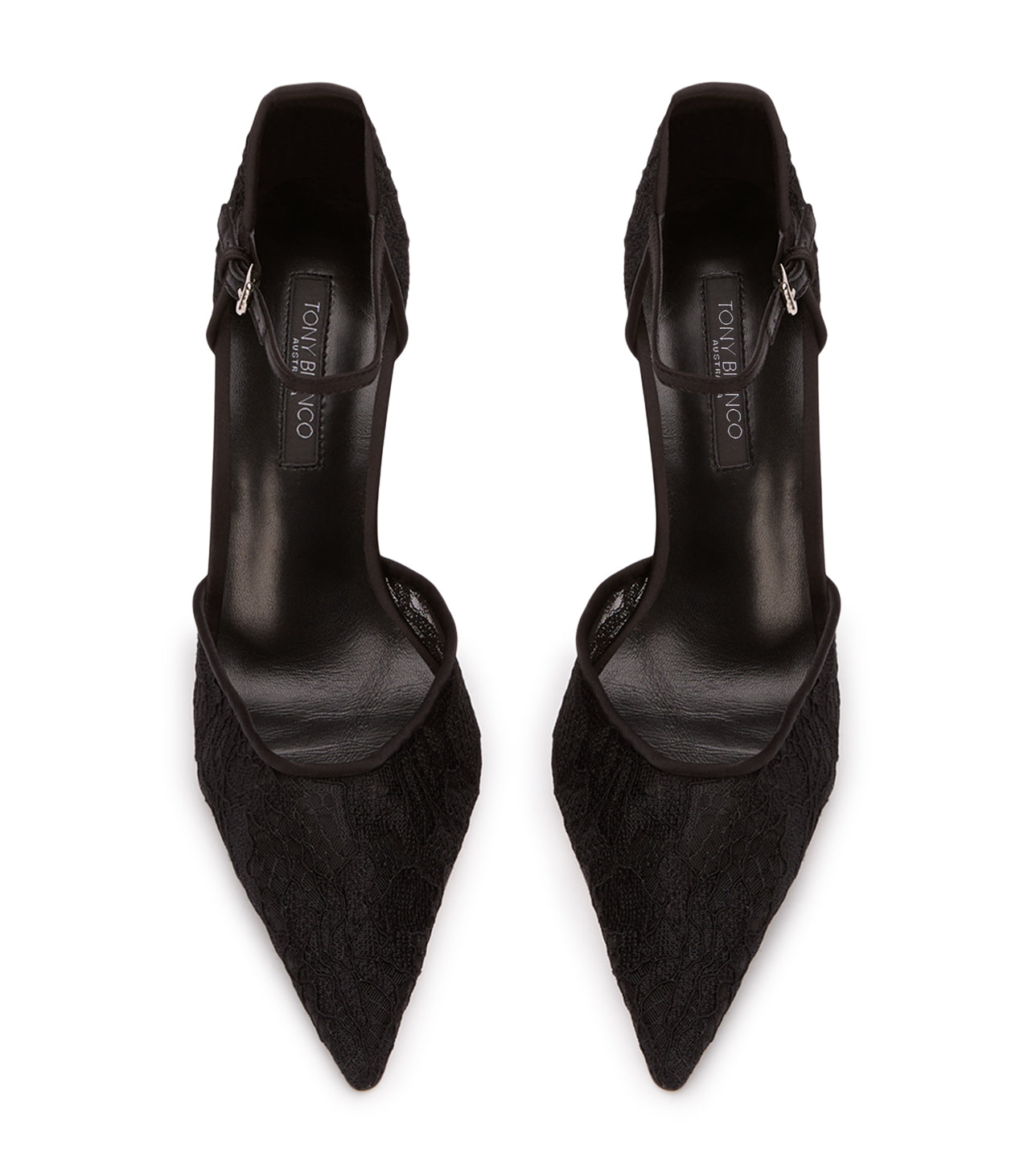 Exuding undeniable allure, these black heels feature a daring mesh/lace structure and an closed pointed toe. Complete with an ankle strap for added support and style, Nina is ready to accompany you to your next event.