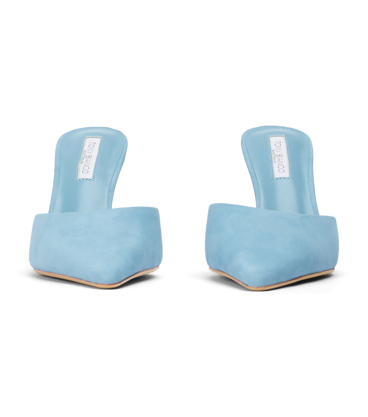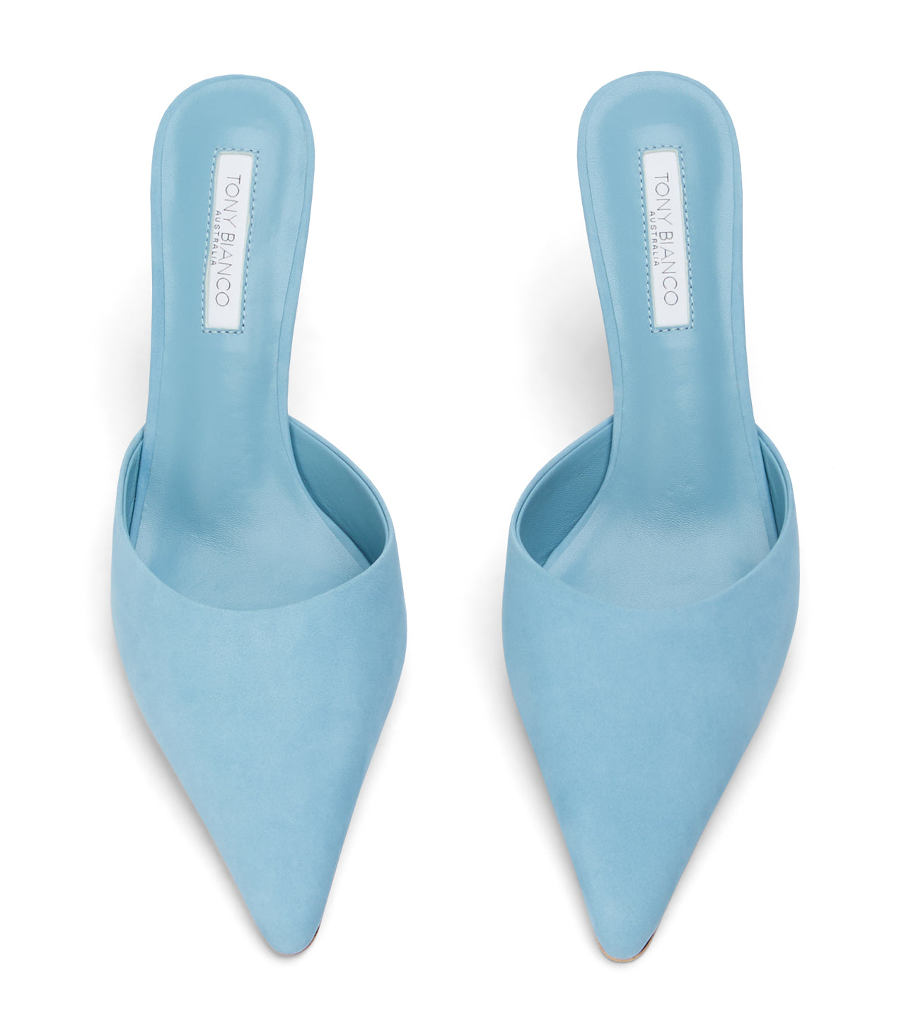 Meet Sicily, your new go-to mule in light blue for effortless elevation. This genuine suede leather design brings back 90s cool with her sharp pointed toe and open back. Finished with a chic low heel, Sicily offers modern minimalism that stands out.