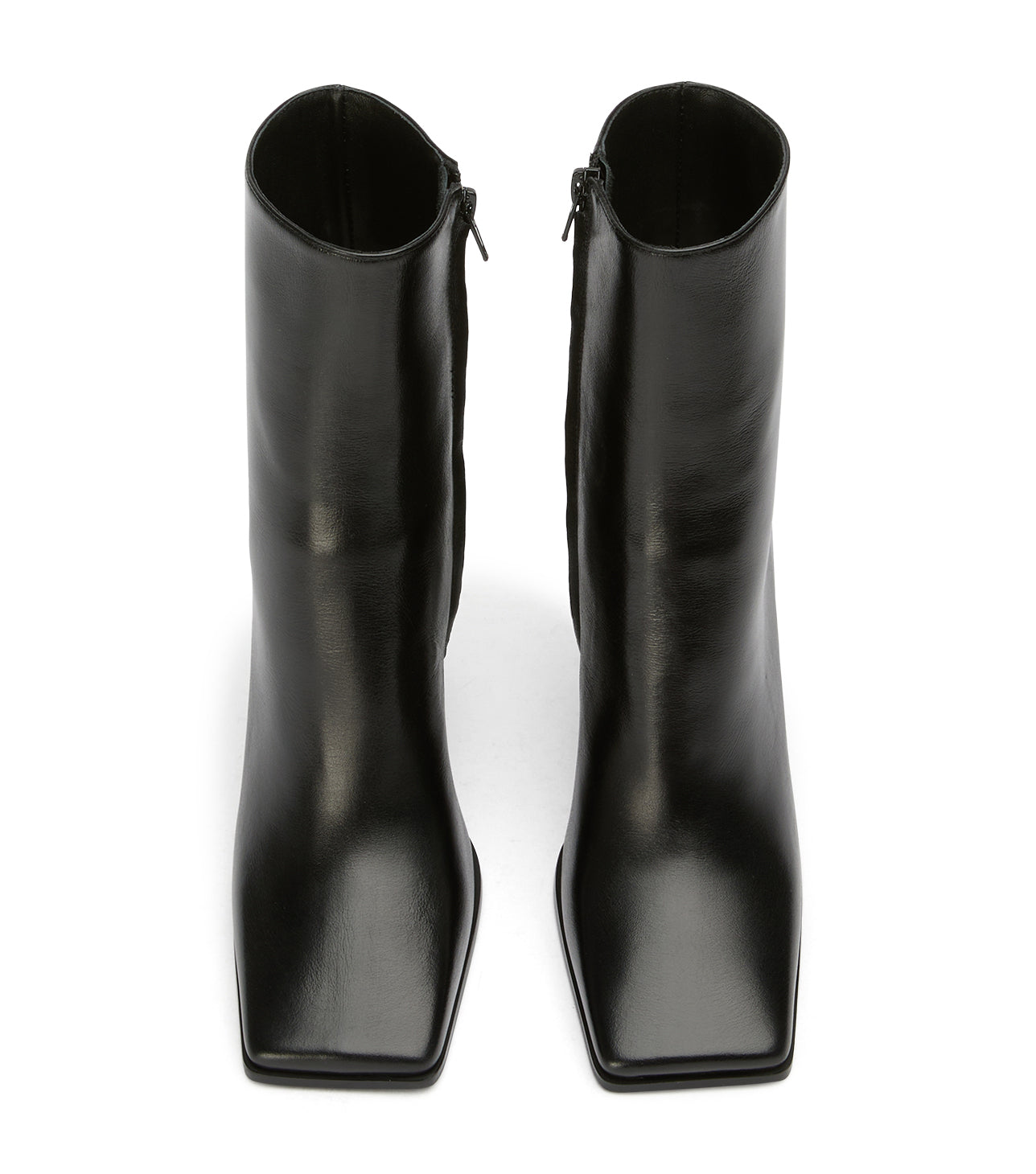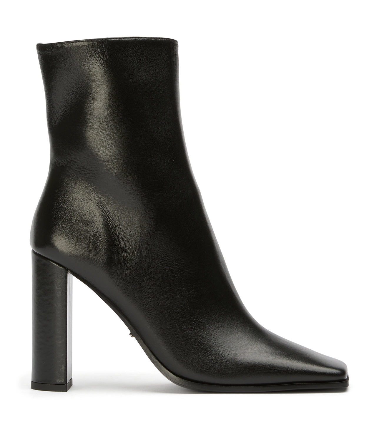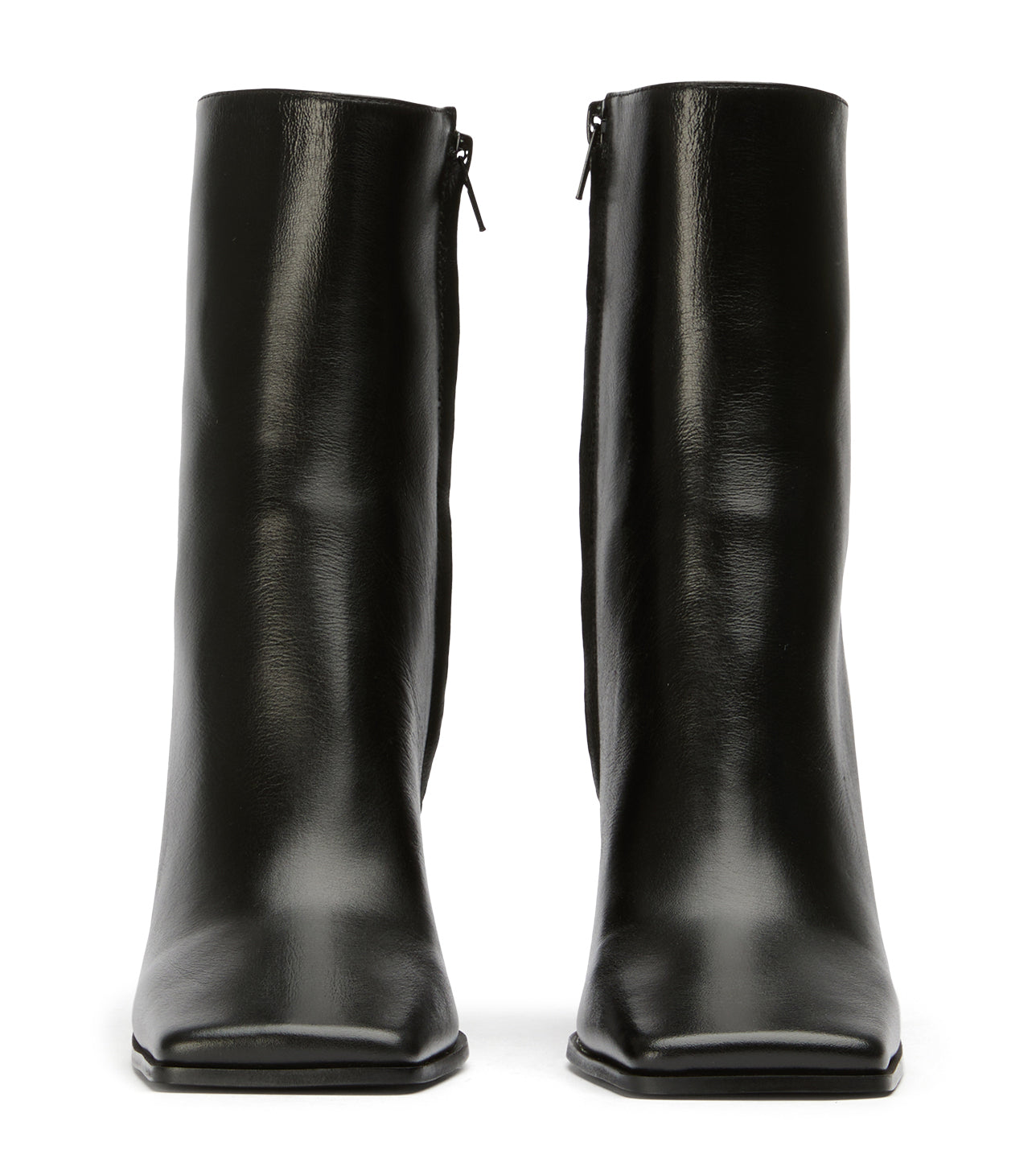 Leroux is a black ankle boot defined by its sleek square toe and sculpted block heel for elevated, modern sophistication. Crafted with a smooth leather finish and streamlined silhouette, this women’s heeled boot is perfect for work-to-weekend styling.