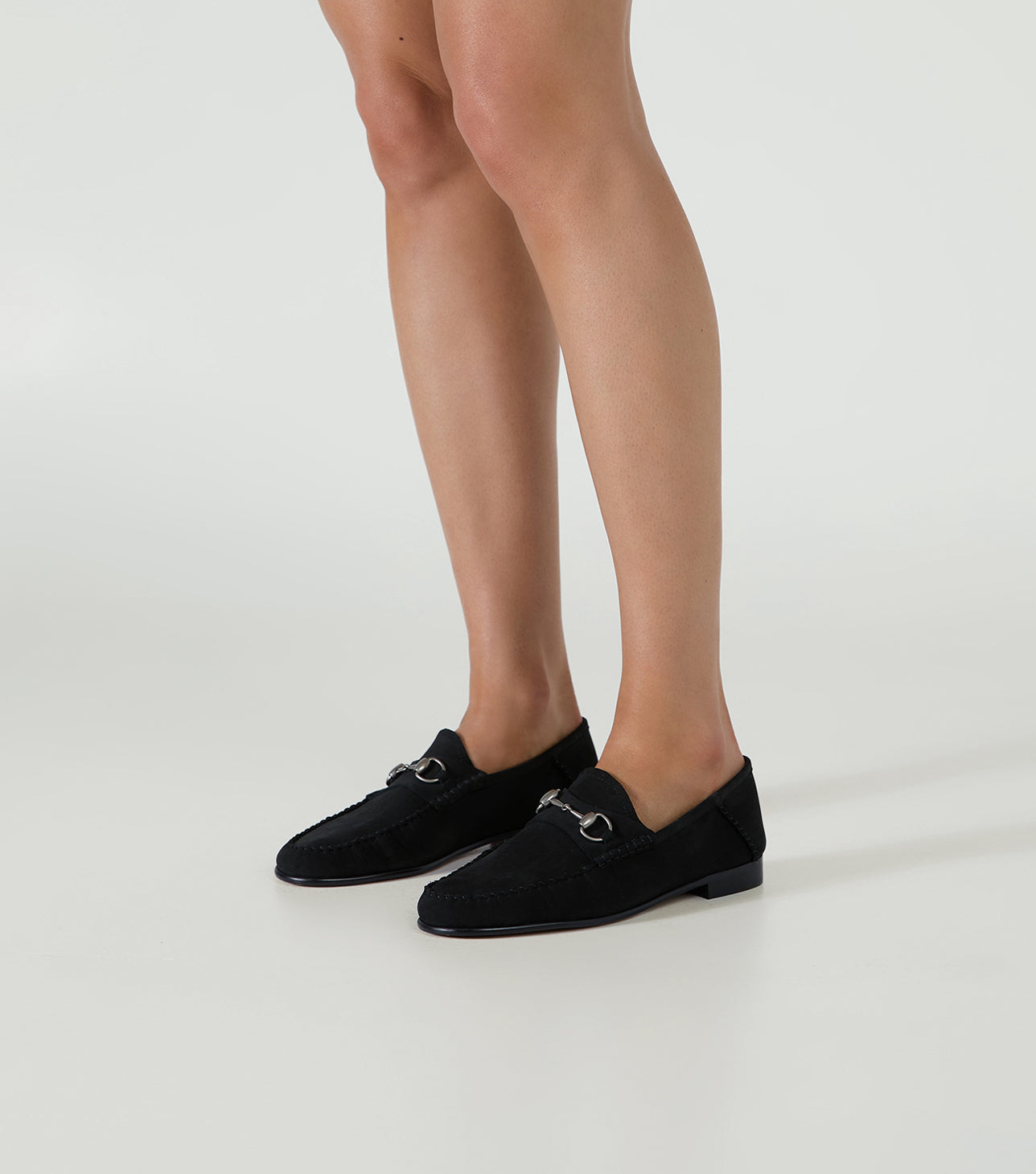 Vixen is a sleek black nubuck loafer accented with a refined silver hardware detail for a modern edge. Designed with a low-profile silhouette and soft finish, this women’s loafer delivers effortless sophistication for everyday wear. Perfect for workwear, smart-casual styling, and elevated off-duty looks.