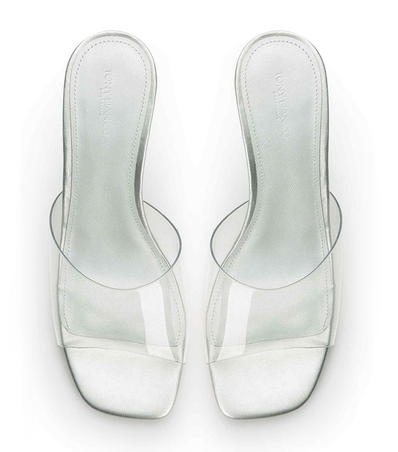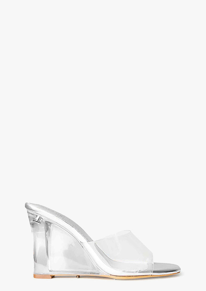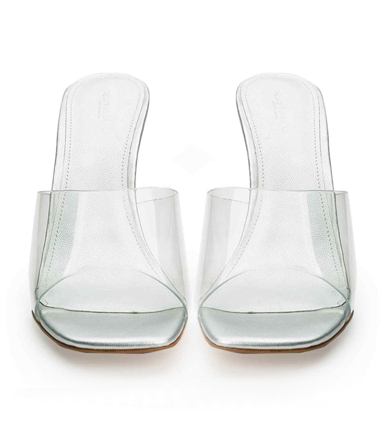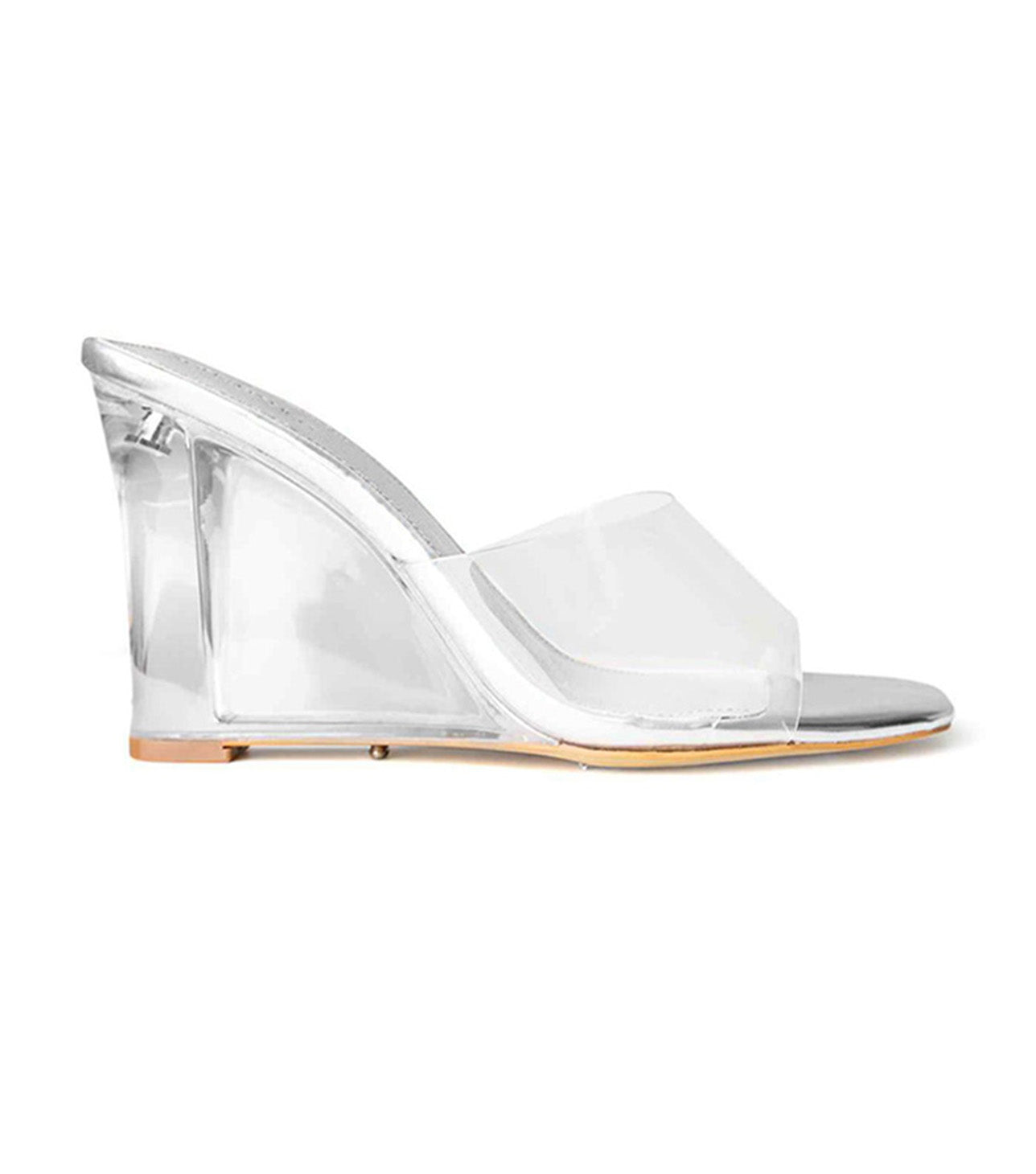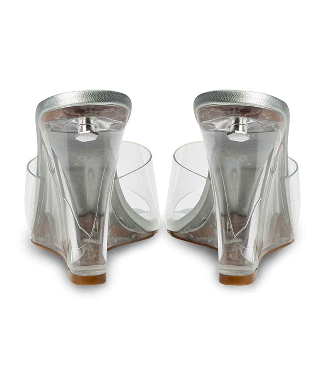 See-through style sorted thanks to the Alessi perspex wedges! Designed with a clear-strap upper, these silver wedge mules come with a leg-lengthening effect and are best paired with a mini dress for your next going-out look.