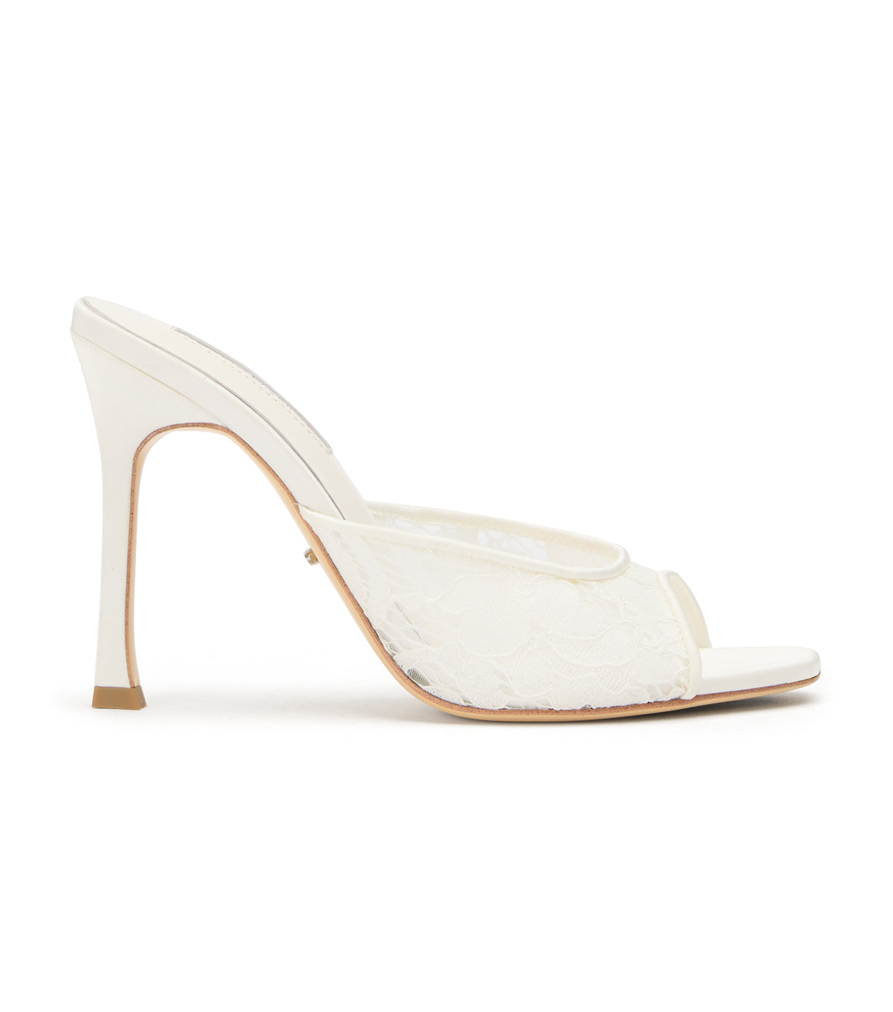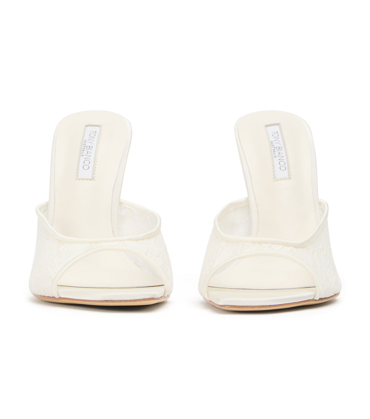 Dashing is a stiletto mule heel with a lace upper that walks the line between soft and sharp. The open-back silhouette keeps it effortless whilst the texture keeps it interesting.