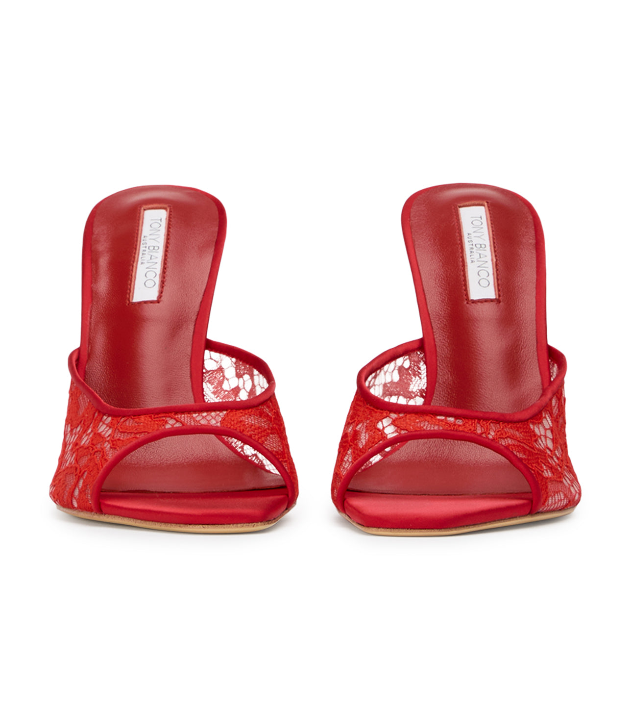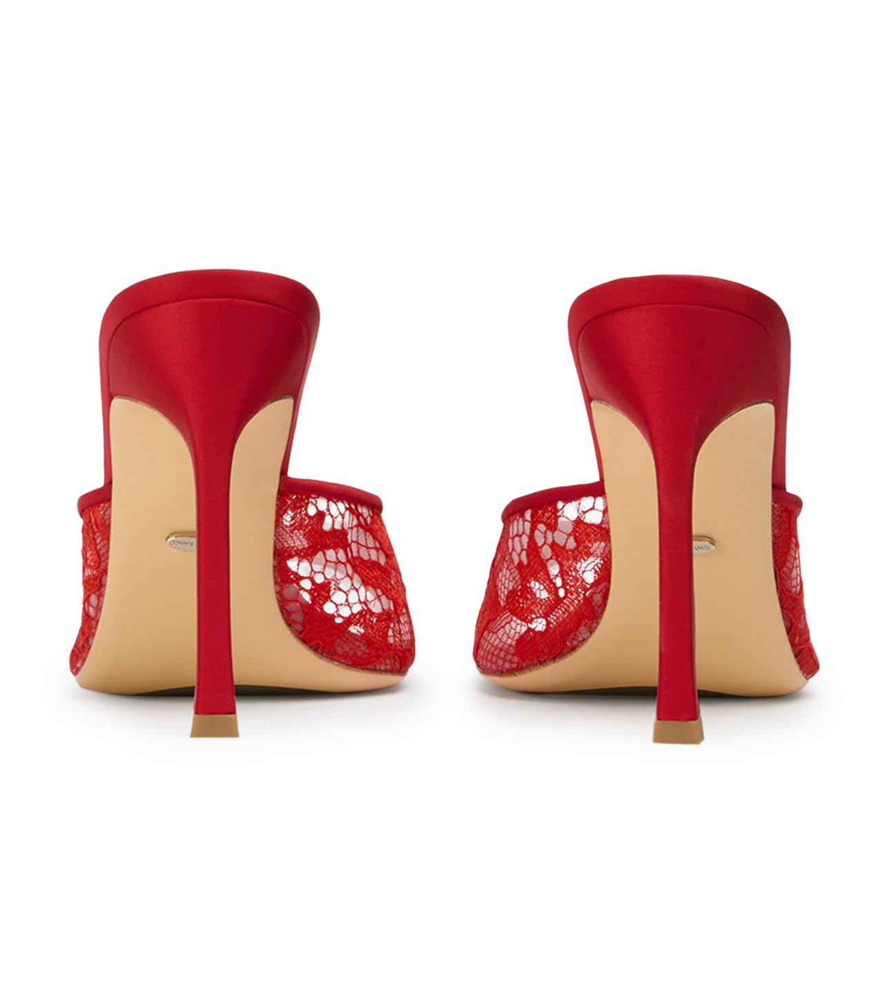 Dashing is a stiletto mule heel with a lace upper that walks the line between soft and sharp. The open-back silhouette keeps it effortless whilst the texture keeps it interesting.
