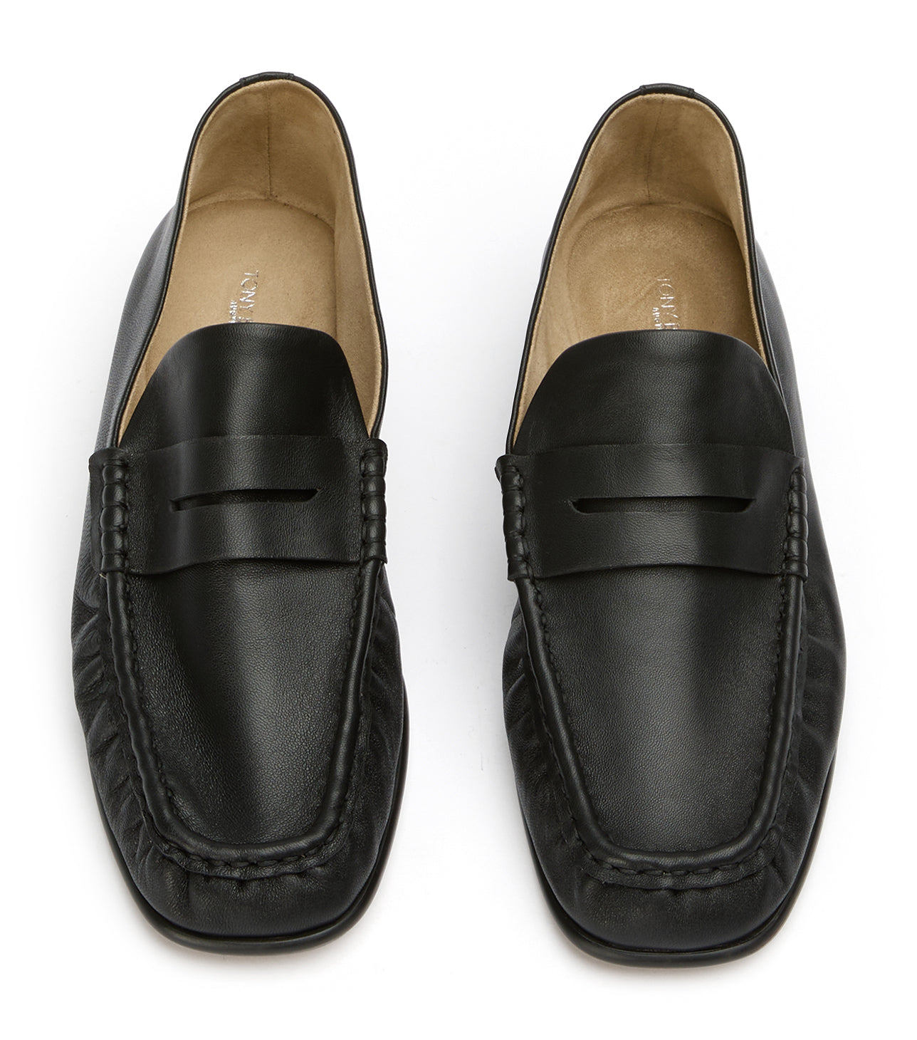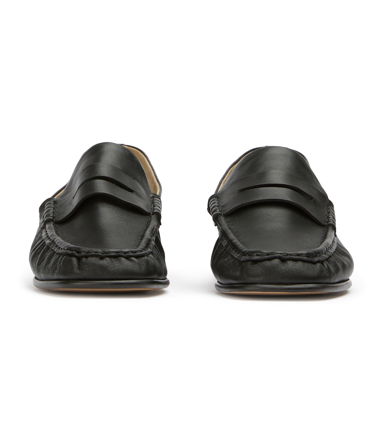 Make the Gomez loafer your new power piece. Crafted in black leather, this flat is a luxurious everyday wardrobe essential, boasting a sleek penny loafer design, scrunch detailing and a durable, comfortable flat heel. It's the stylish statement that instantly elevates your casual look, making it ideal for the office or adding polish to a weekend outfit.