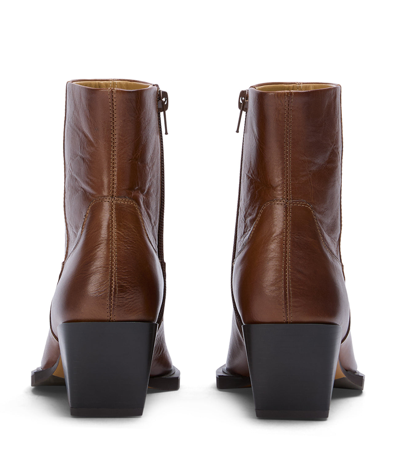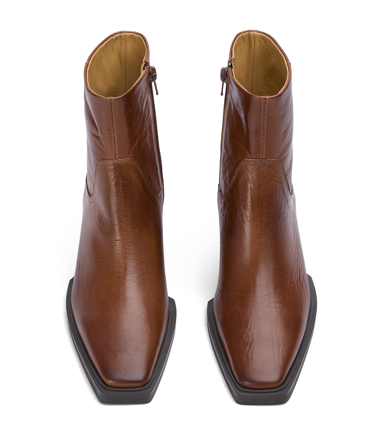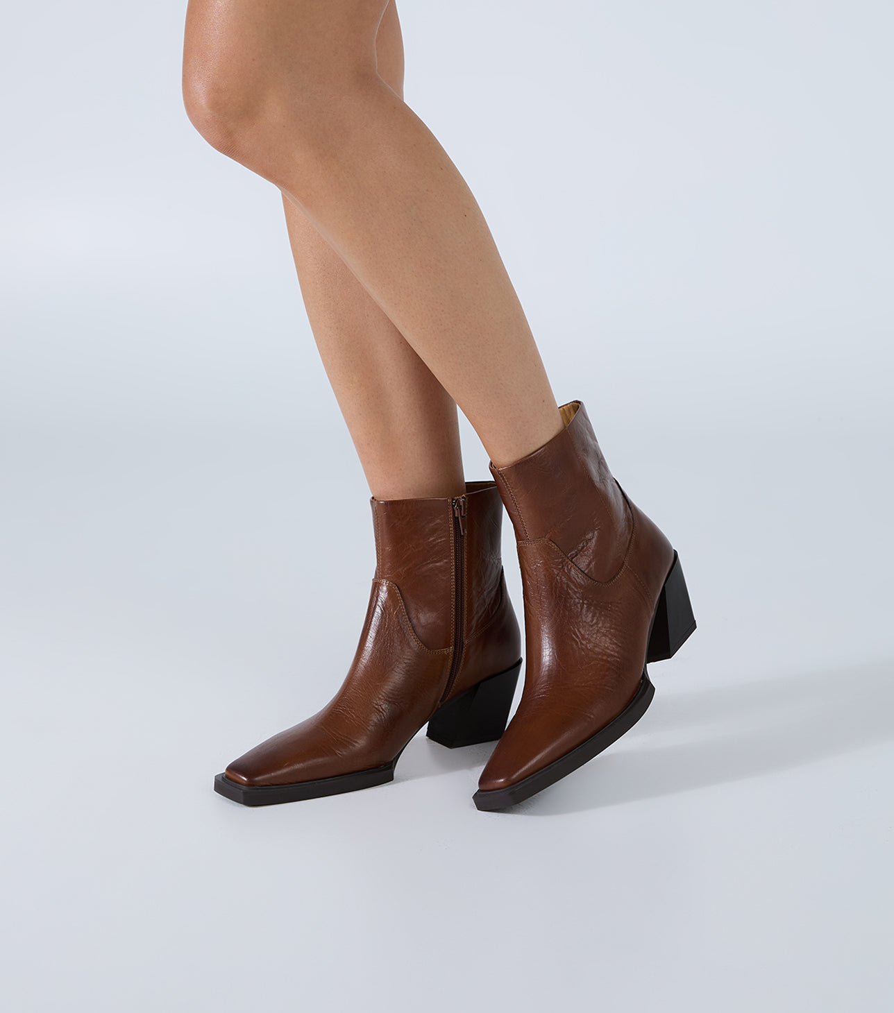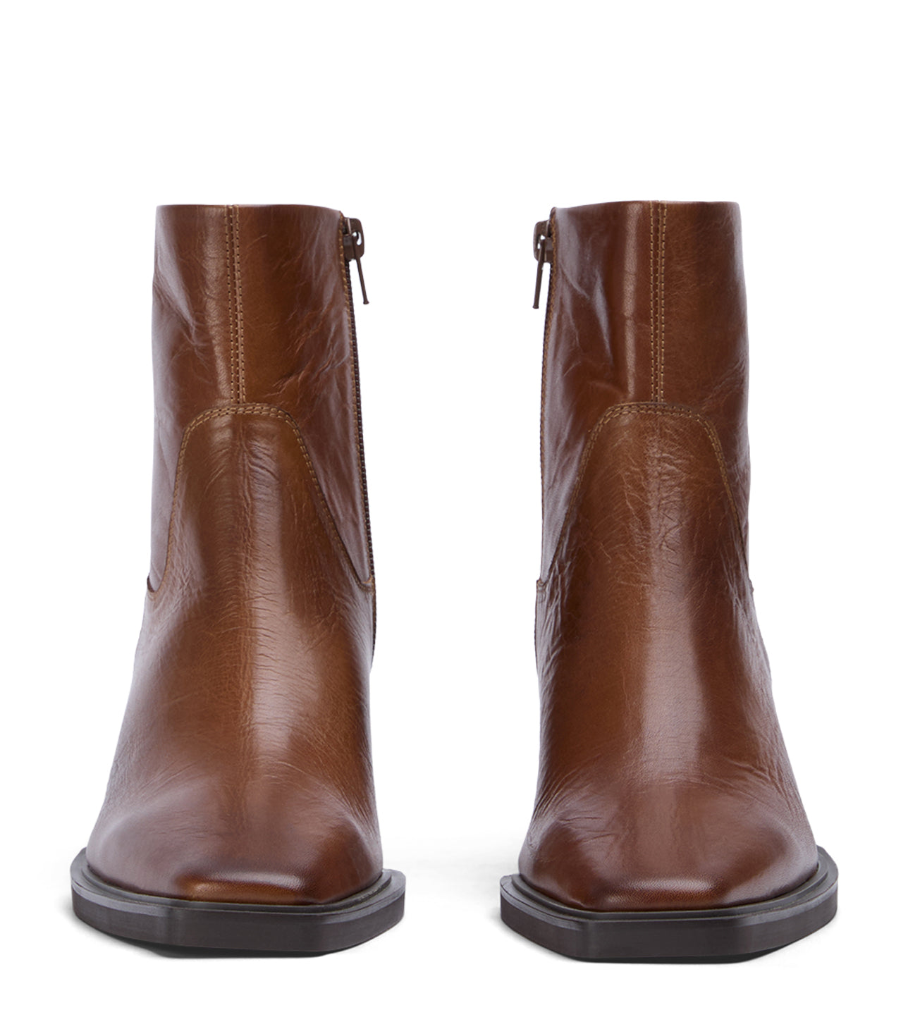 The Holly ankle boot features a square toe and a sharp angular block heel for a bold, contemporary look. Its distinctive silhouette effortlessly adds a touch of edge to any outfit, making it a standout piece in your wardrobe.