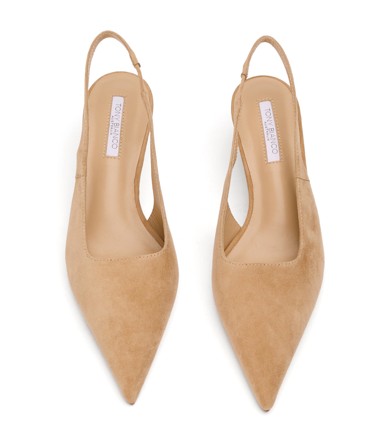 Jacki offers a fresh twist on a classic. With her pointed toe and curved heel, she's finished in our signature suede leather for an effortlessly chic look.