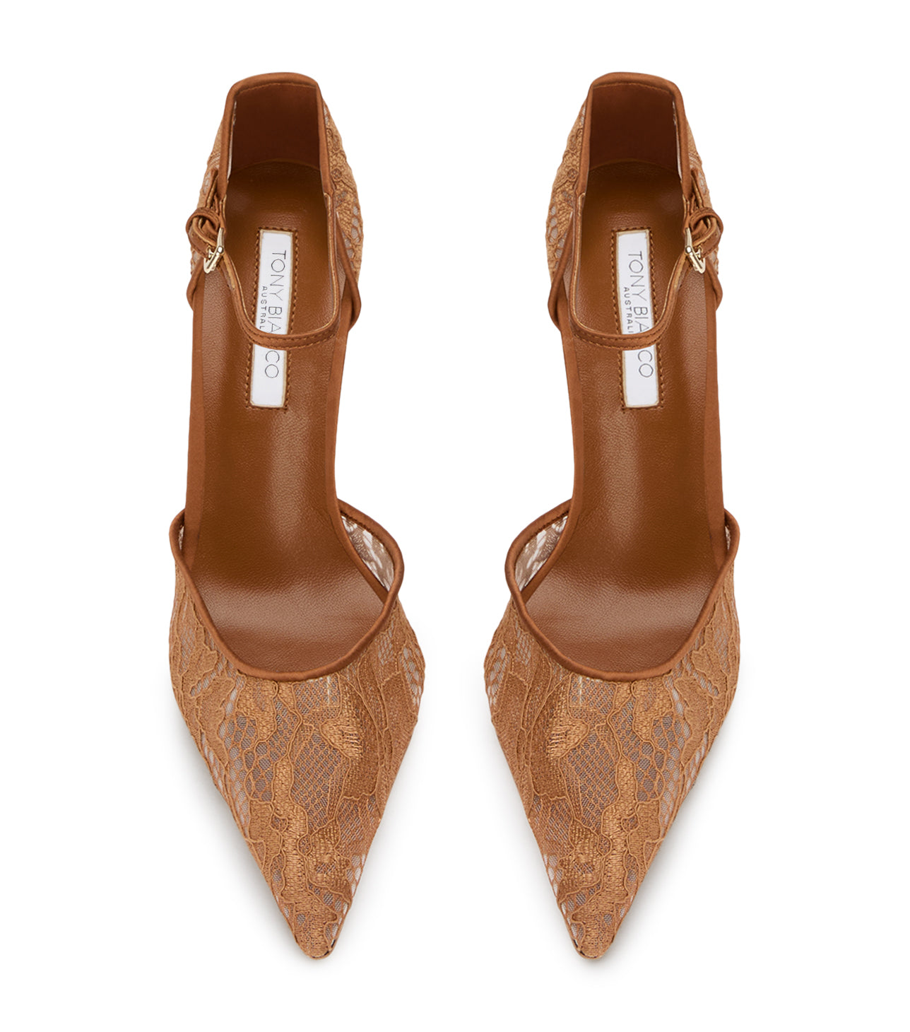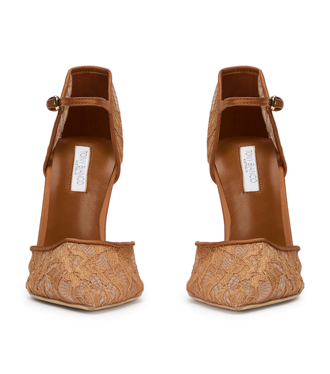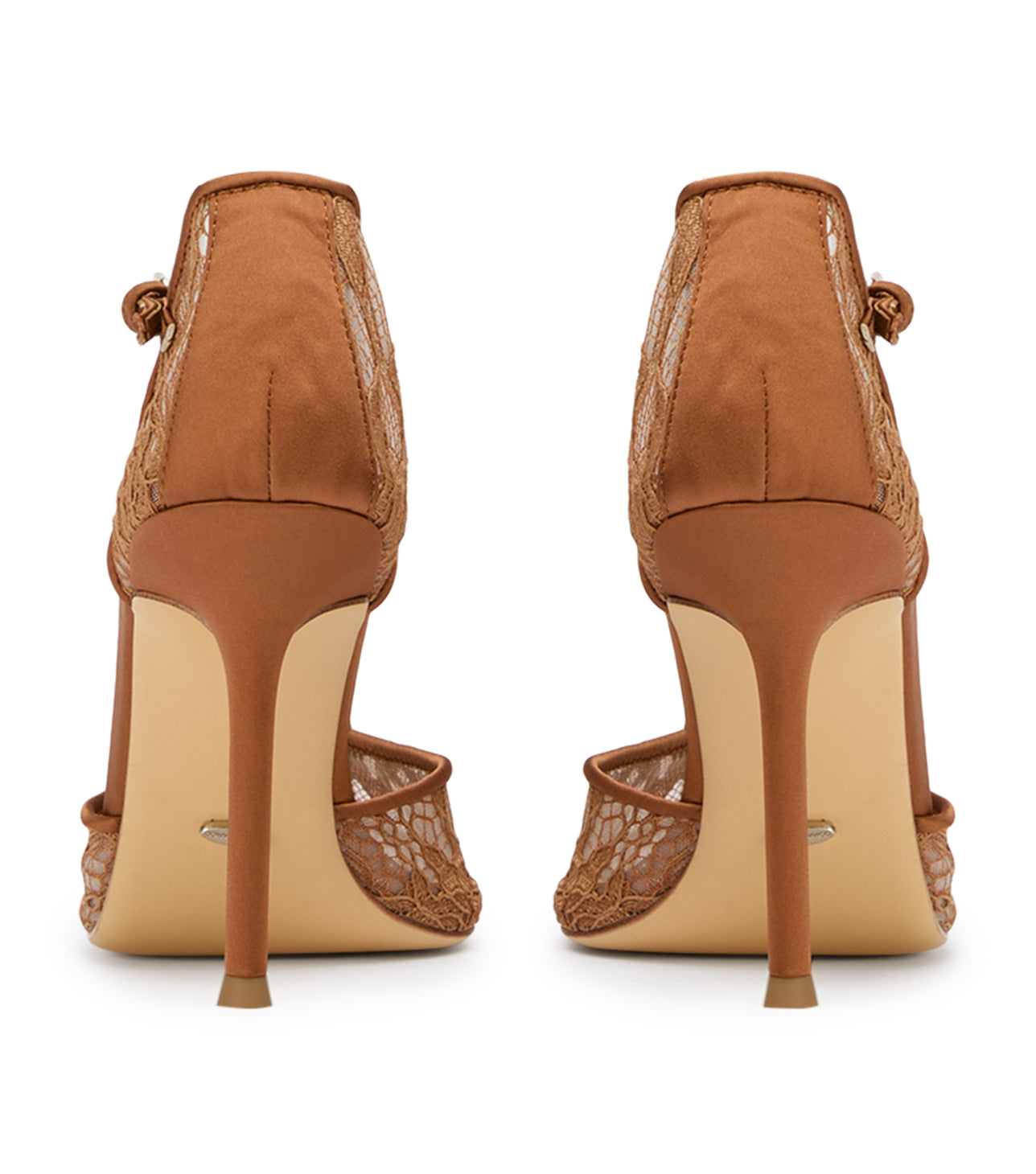 Exuding undeniable allure, these black heels feature a daring mesh/lace structure and an closed pointed toe. Complete with an ankle strap for added support and style, Nina is ready to accompany you to your next event.