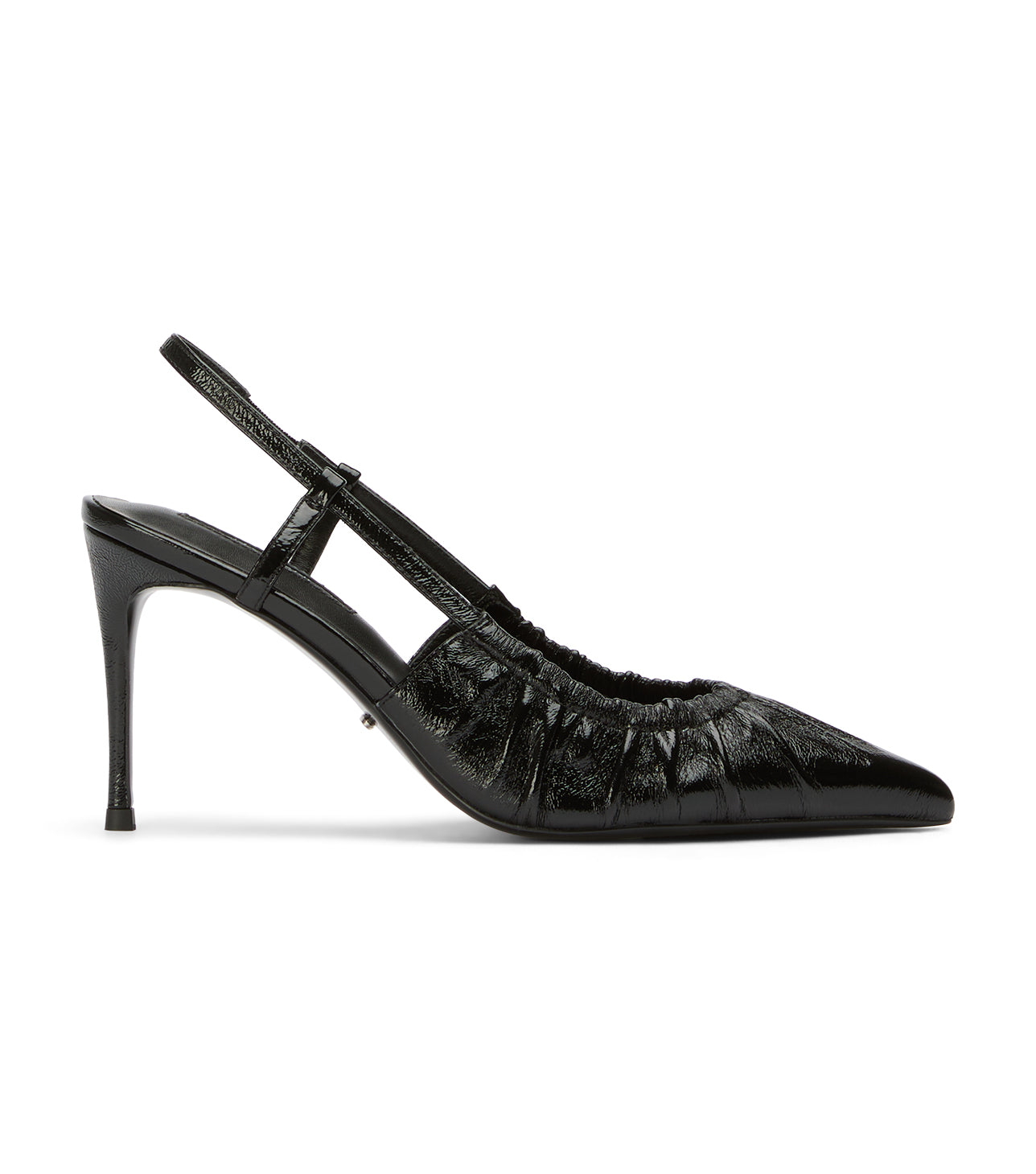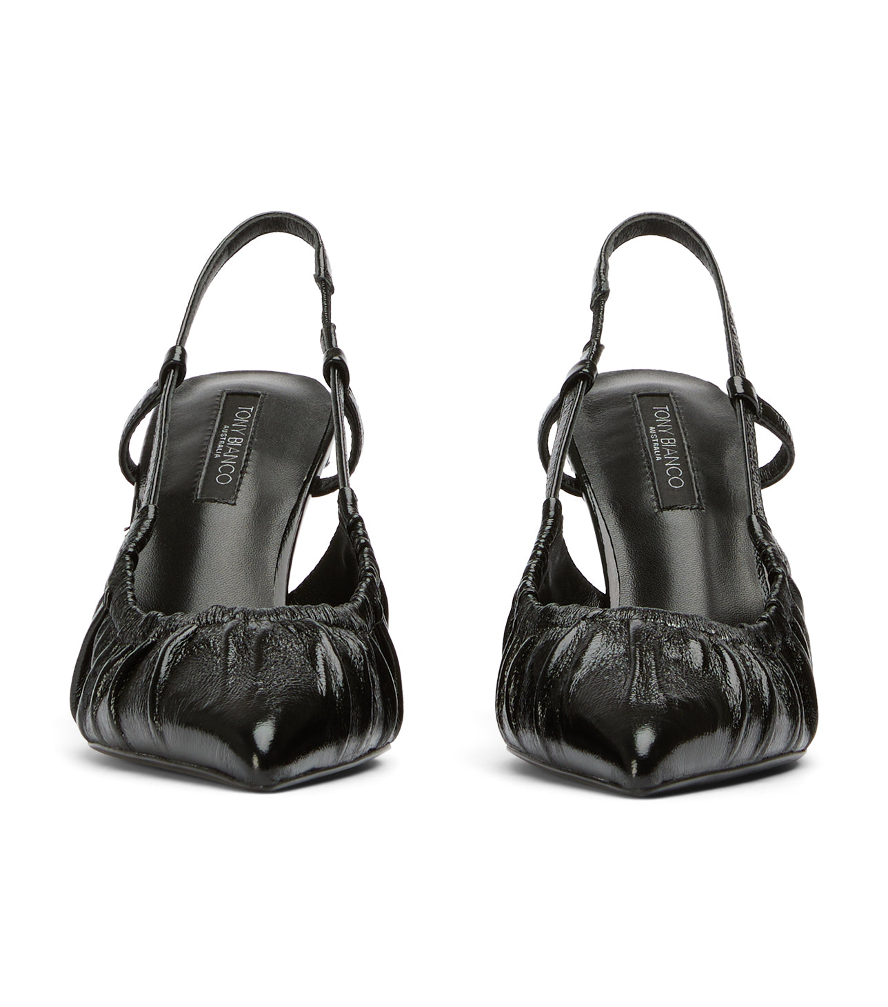Presh is a sleek black slingback heel featuring a pointed toe with soft gathering detail for a modern, sculpted look. Designed with a high stiletto heel and glossy patent finish, this women’s heel delivers elevated elegance for evening wear, events, and statement styling.