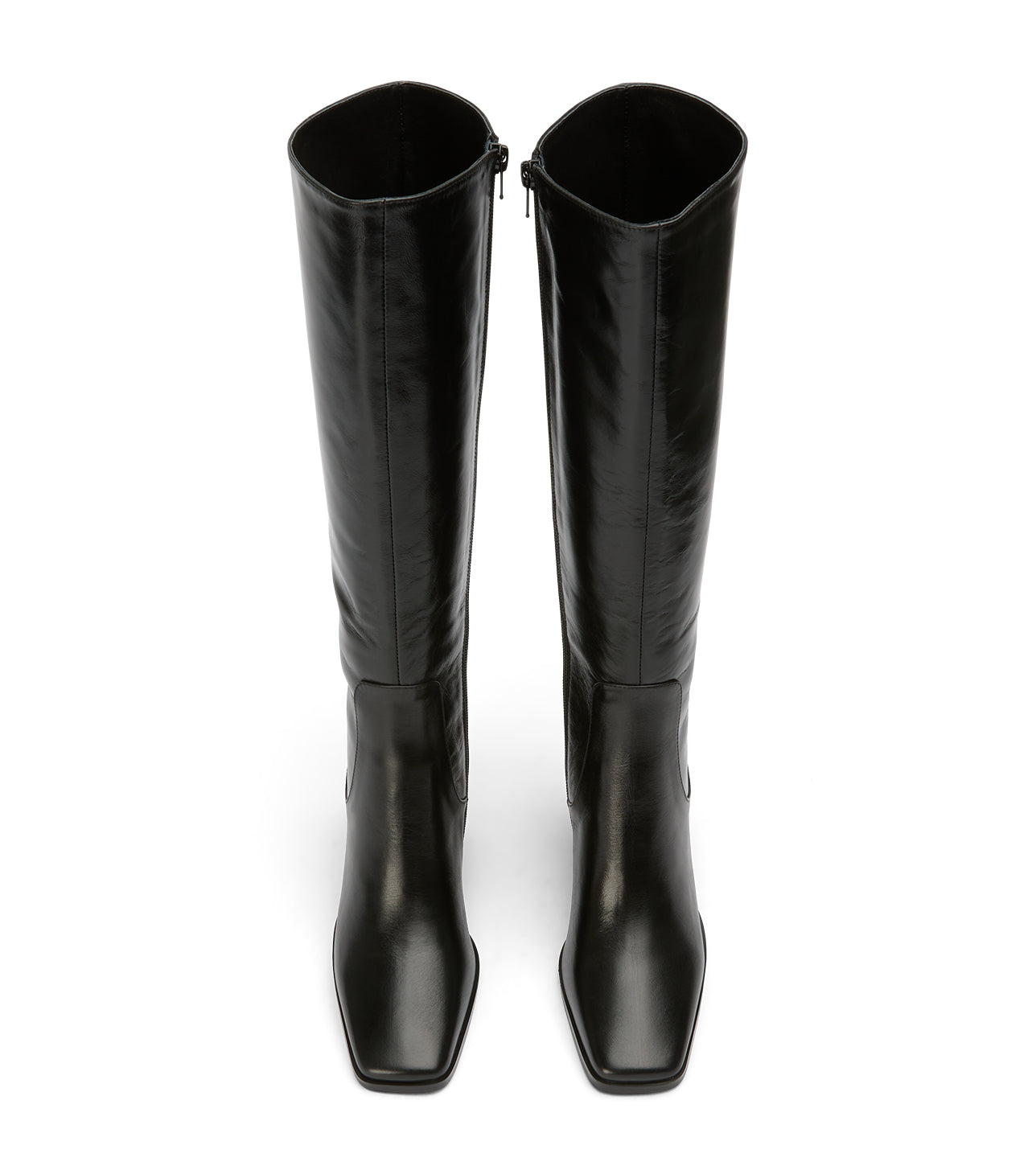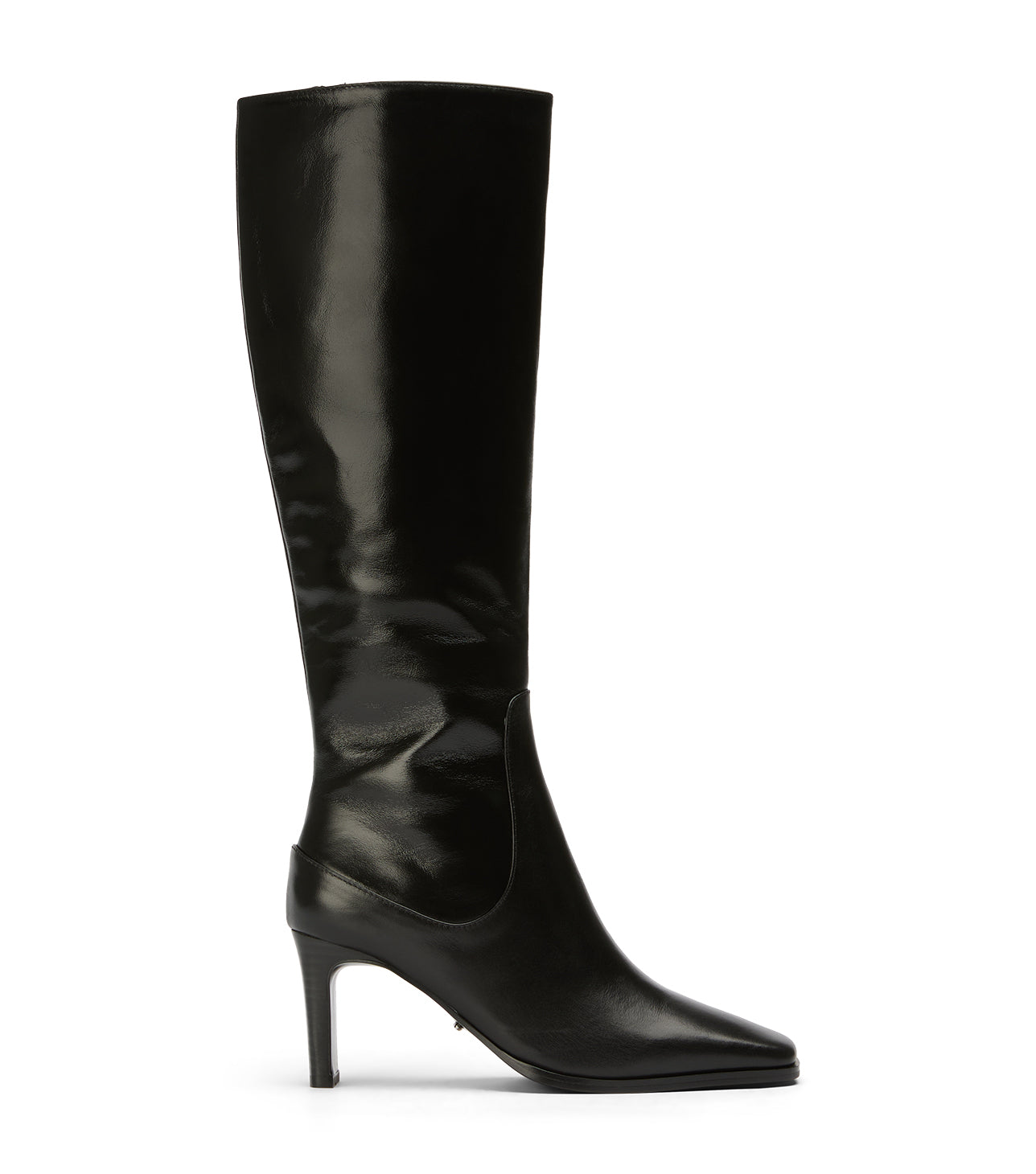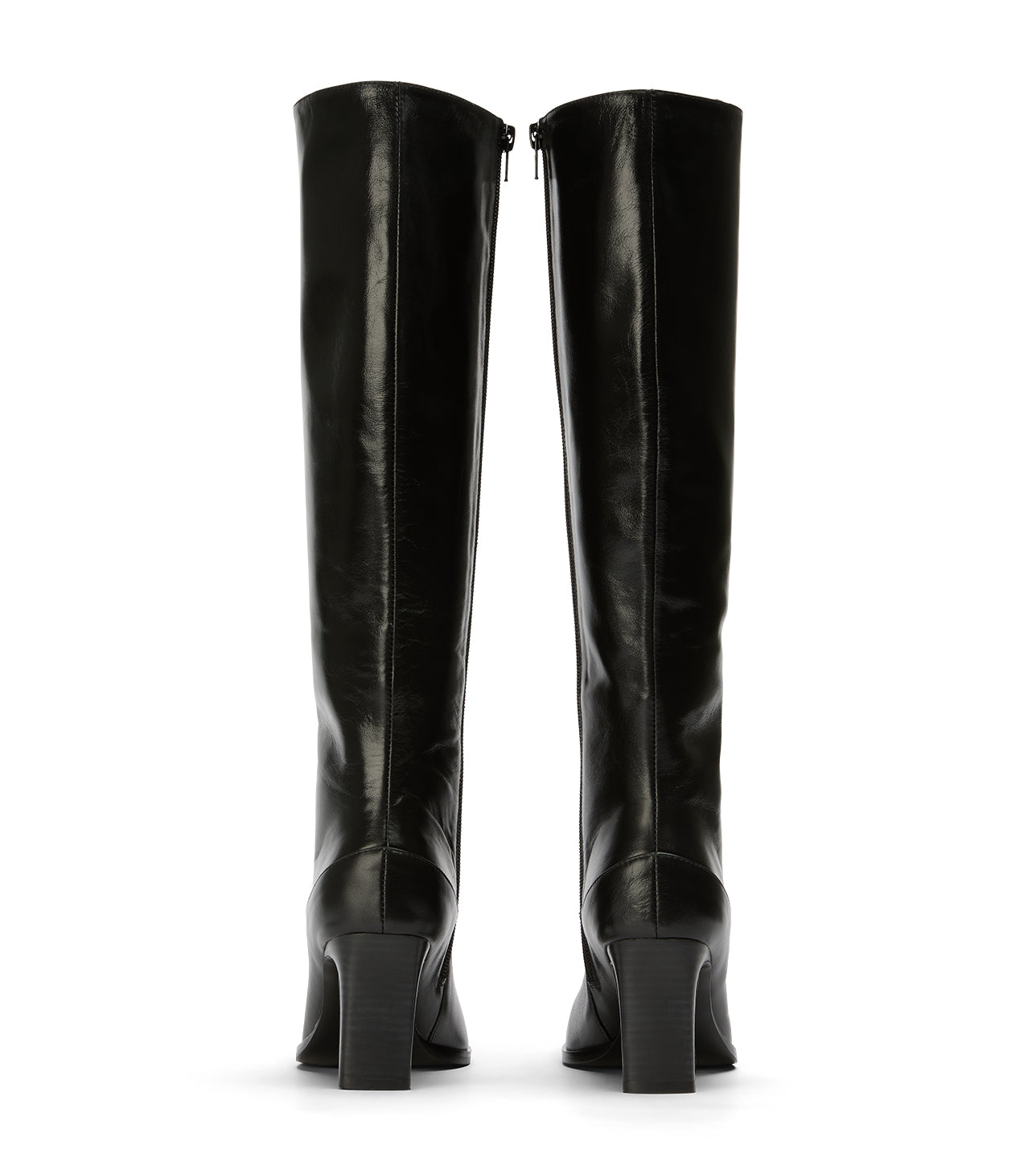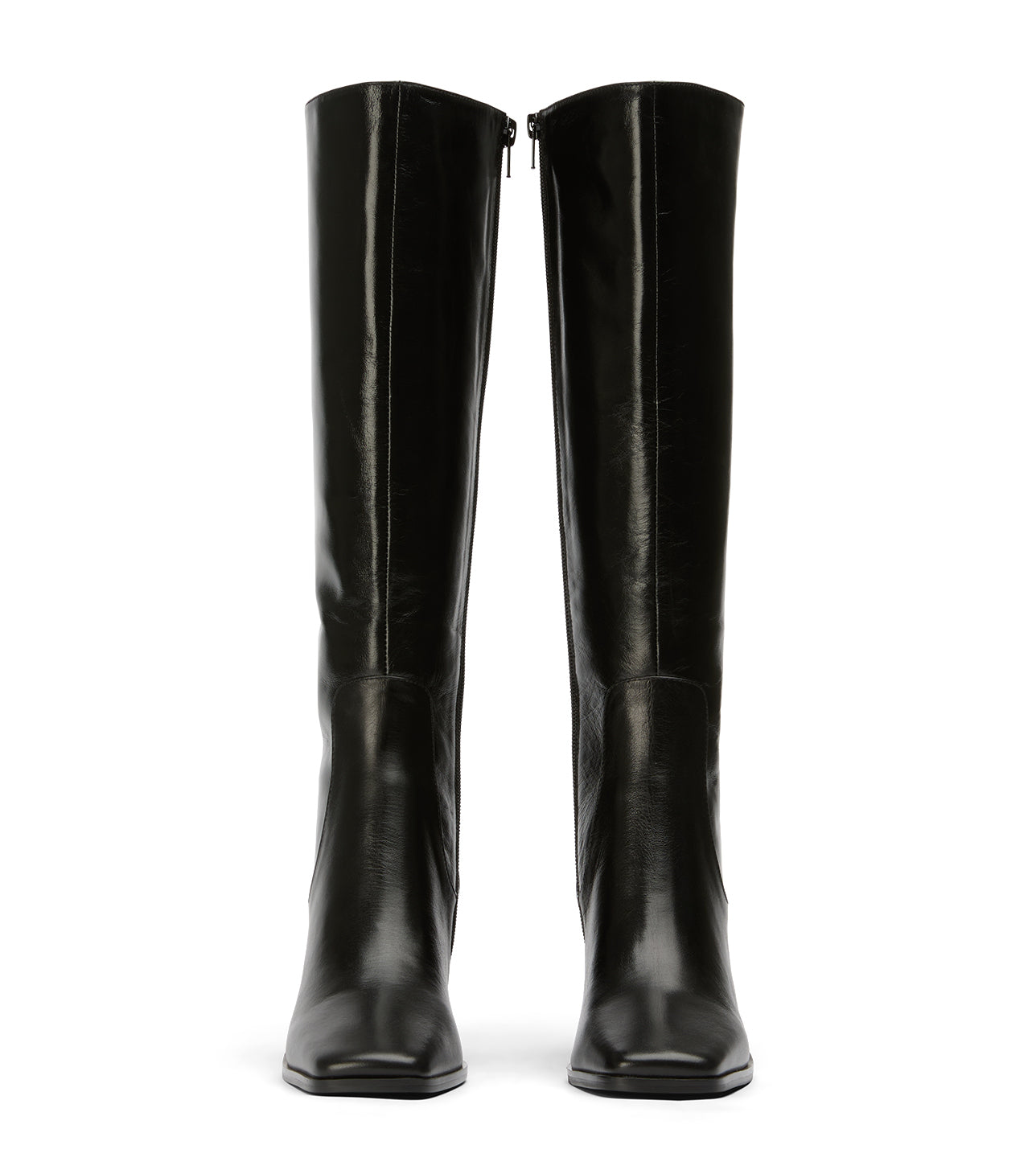 Rinetta is a modern calf-high boot crafted in black, designed with a sharp square toe for a refined, on-trend silhouette. Finished with a sleek mid heel, this women’s suede boot pairs effortlessly with dresses or tailored layers for elevated everyday styling.