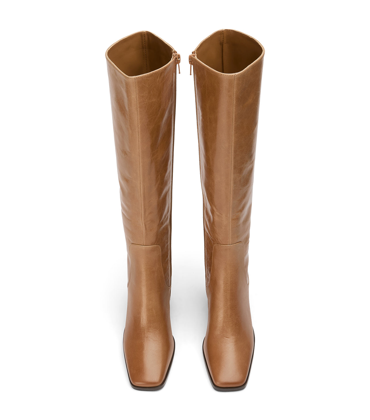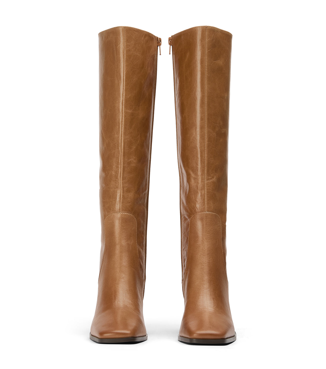 Rinetta is a modern calf-high boot crafted in a warm tan, designed with a sharp square toe for a refined, on-trend silhouette. Finished with a sleek mid heel, this women’s suede boot pairs effortlessly with dresses or tailored layers for elevated everyday styling.