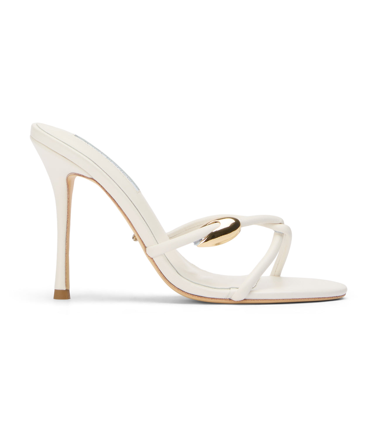 Starr is a stiletto mule heel featuring a strappy crossover design accented with a gold bead detail. This standout heel delivers a bold silhouette with eye-catching shine.