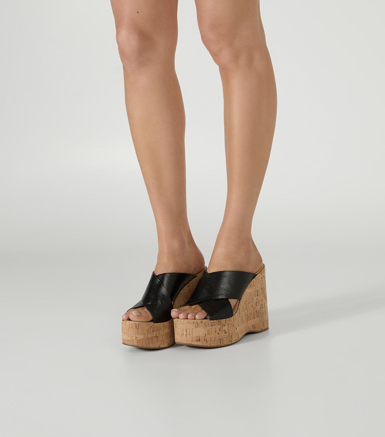 A leather wedge heel with open toe and crossover strap detailing, Vamore channels 2000s-era confidence with a sculpted lift and clean lines. Designed to elevate any look with ease.